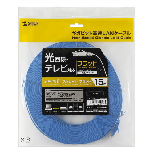 薄さ1.5mmのフラットタイプ、ツメ折れ防止カバー付きギガビット完全対応LANケーブル。15m・ブルー。