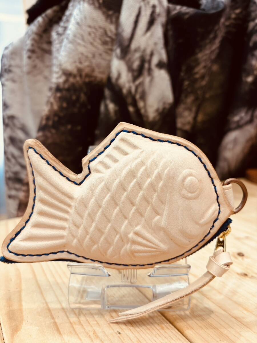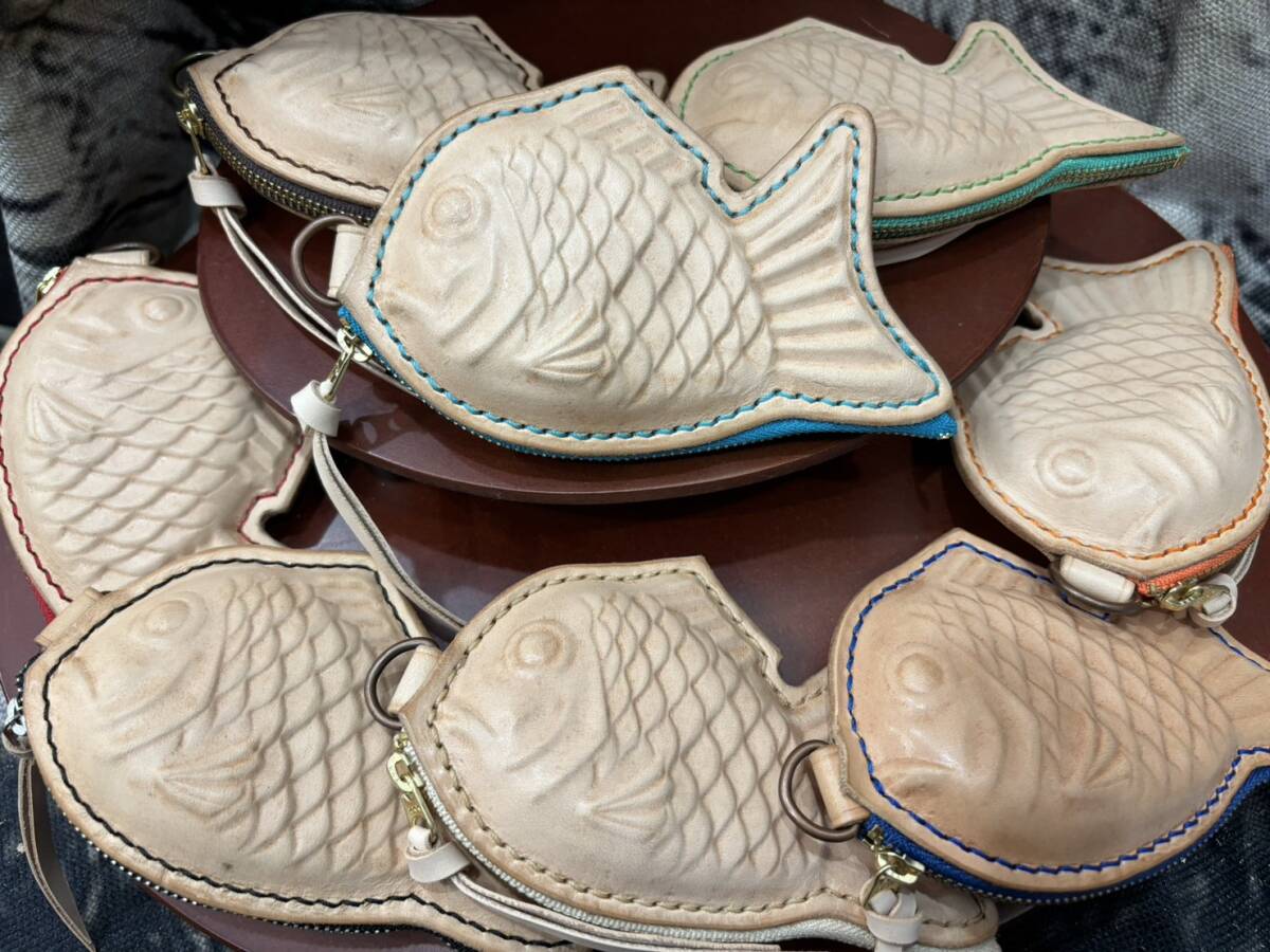 国産のヌメ革約1.8mm厚を使用し、たい焼きの形を使用し一匹ずつハンドメイドにて作成いたしました。