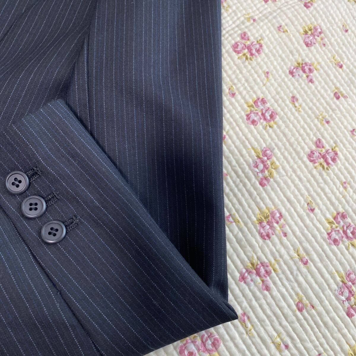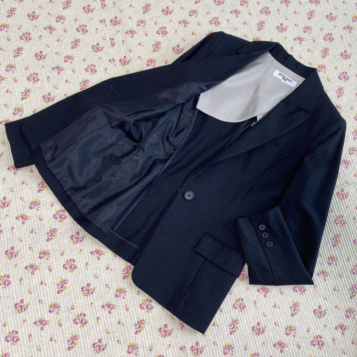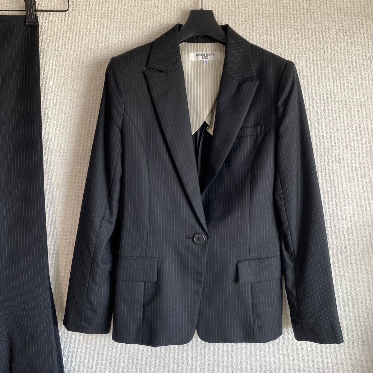 NATURAL BEAUTY BASIC(ナチュラルビューティーベーシック)のお品です。ウール、シルク混生地の背抜き仕立てです。春秋にお召しになれると思います。オフィスやビジネスカジュアルな場での利用に最適です。ストレッチ性があり、長時間の着用でも快適に過ごせます。スタイリッシュなコーディネートが楽しめます。ジャケットは、フロントにボタンが1つ付いています。センターベント。袖口に3つボタンが付いています。ジャケット、外ポケット×3。内ポケット×0。パンツポケット、フロント×2、後ろ×2でございます。お色は画像でご確認ください。濃紺生地に薄い水色ストライプです。実際のお色に近いお色が良く出ています。春秋用の【極美】パンツスーツです。クリーニング済み。