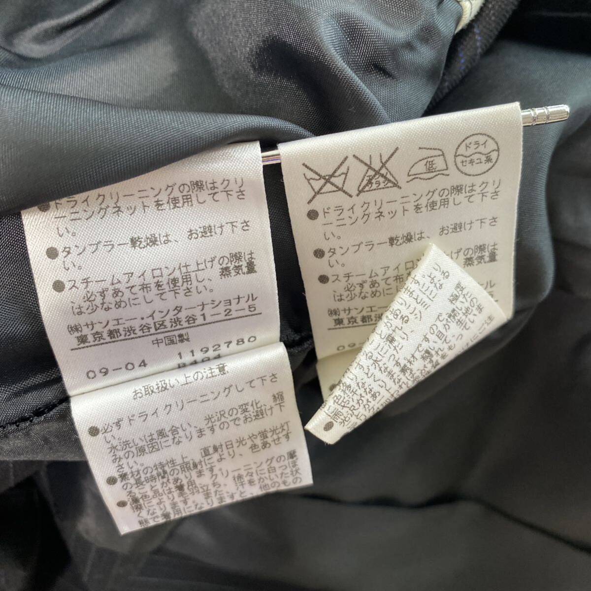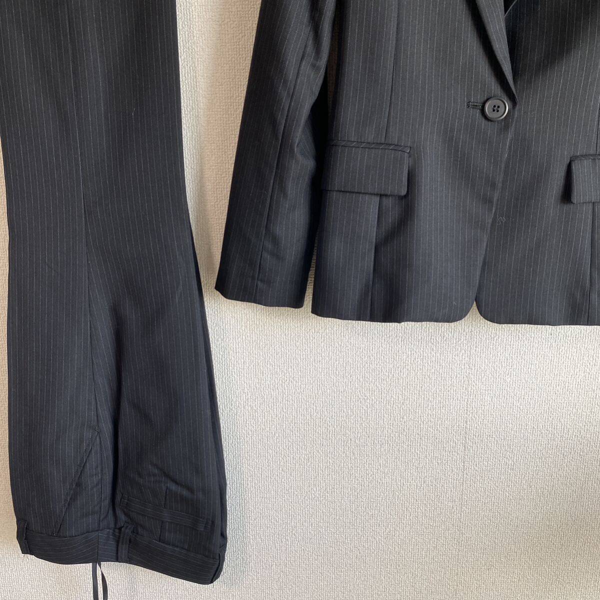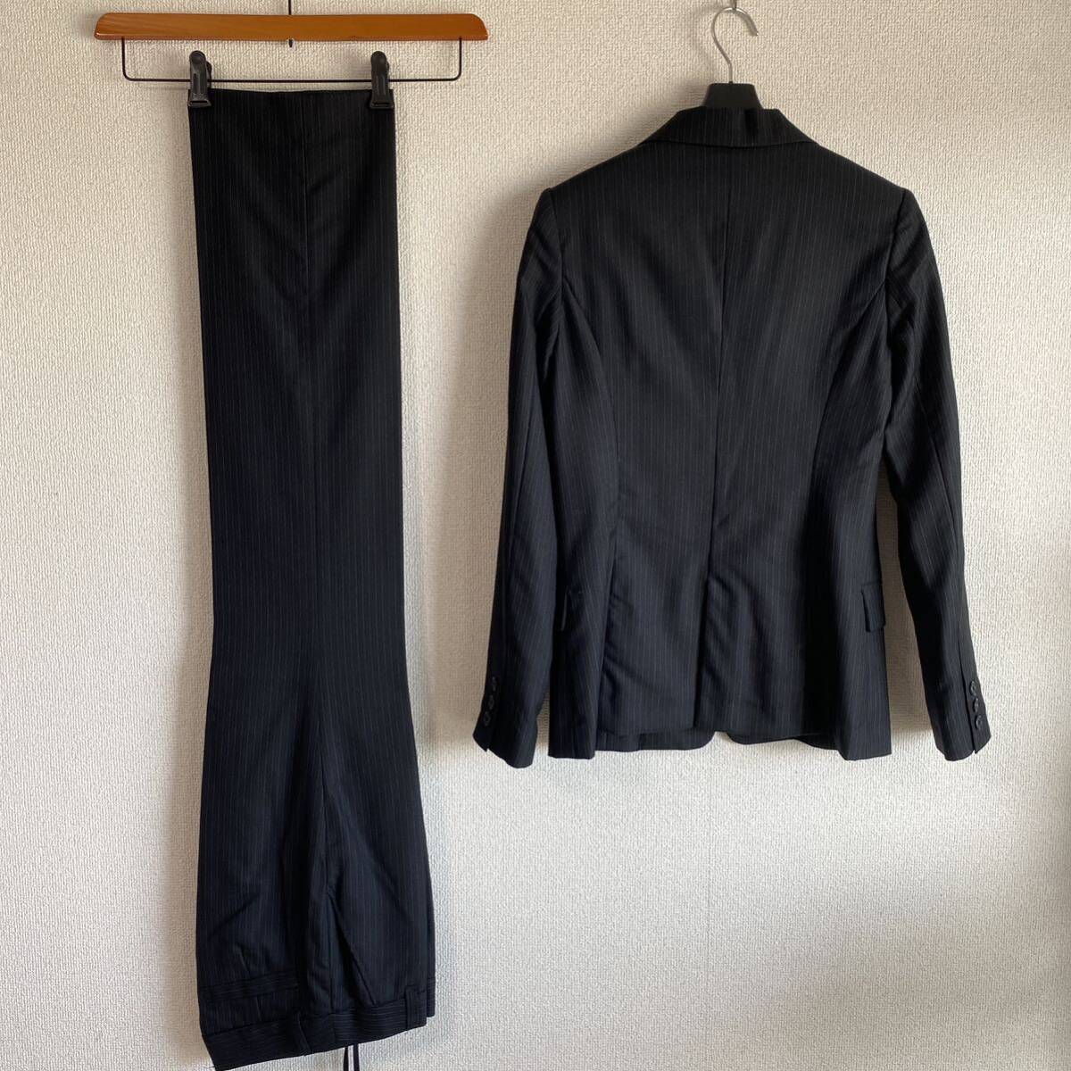 NATURAL BEAUTY BASIC(ナチュラルビューティーベーシック)のお品です。ウール、シルク混生地の背抜き仕立てです。春秋にお召しになれると思います。オフィスやビジネスカジュアルな場での利用に最適です。ストレッチ性があり、長時間の着用でも快適に過ごせます。スタイリッシュなコーディネートが楽しめます。ジャケットは、フロントにボタンが1つ付いています。センターベント。袖口に3つボタンが付いています。ジャケット、外ポケット×3。内ポケット×0。パンツポケット、フロント×2、後ろ×2でございます。お色は画像でご確認ください。濃紺生地に薄い水色ストライプです。実際のお色に近いお色が良く出ています。春秋用の【極美】パンツスーツです。クリーニング済み。