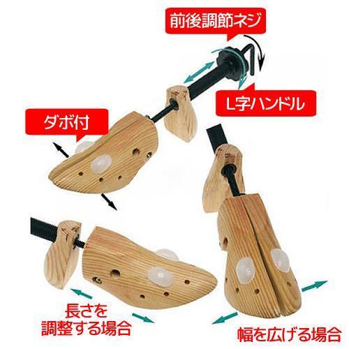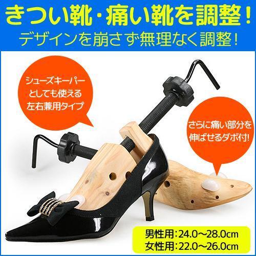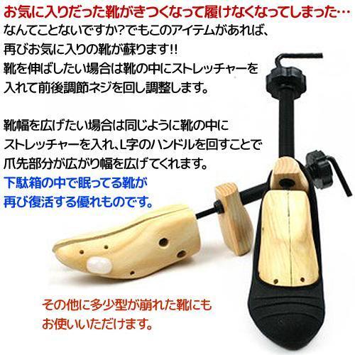| 2個セットとなります。 シューズストレッチャー 商品説明お気に入りだった靴がきつくなって履けなくなってしまった…。 なんてことないですか?でもこのアイテムがあれば、再びお気に入りの靴が蘇ります!! 靴を伸ばしたい場合は靴の中にストレッチャーを入れて前後調節ネジを回し調整します。 靴幅を広げたい場合は同じように靴の中にストレッチャーを入れ、 L字のハンドルを回すことで爪先部分が広がり幅を広げてくれます。 下駄箱の中で眠ってる靴が再び復活する優れものです。 セットした状態で少なくとも2日間は放置してください。さらに広げたいときは繰り返しセットしてお使いください。 ※注意・・広げすぎにご注意ください。靴が破損する恐れがあります。 サイズ 【適用サイズ】 男性用/24.0?28.0cm 女性用/22.0?26.0cm 【商品サイズ】 男性用/約36.5×8×8.5cm 女性用/約33×7×7cm 材質本体/パイン材、スチール ダボ:ポリプロピレン |