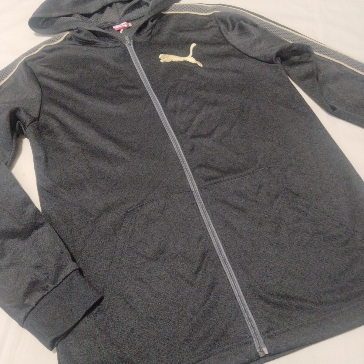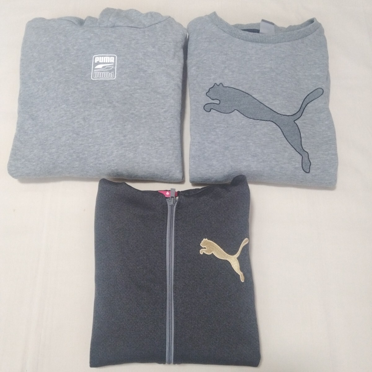 プーマの3枚セットです。トレーナーとプルオーバーパーカー、ジップアップパーカーが入っています。ジップアップパーカーは袖とバックに吊れがに3箇所ございます。着用感はございますが、まだまだ着ていただけます。