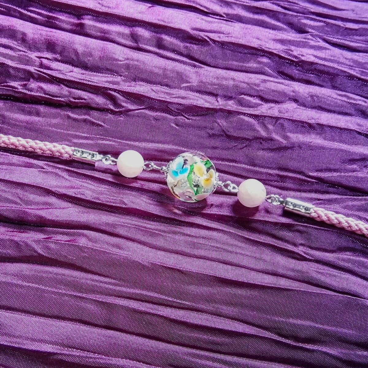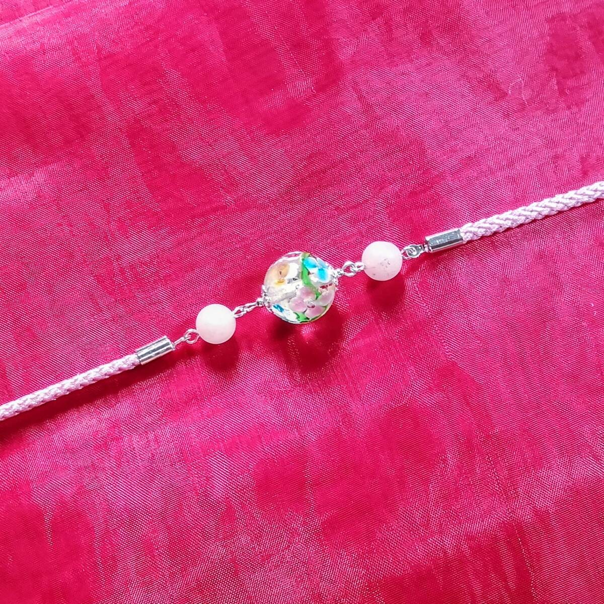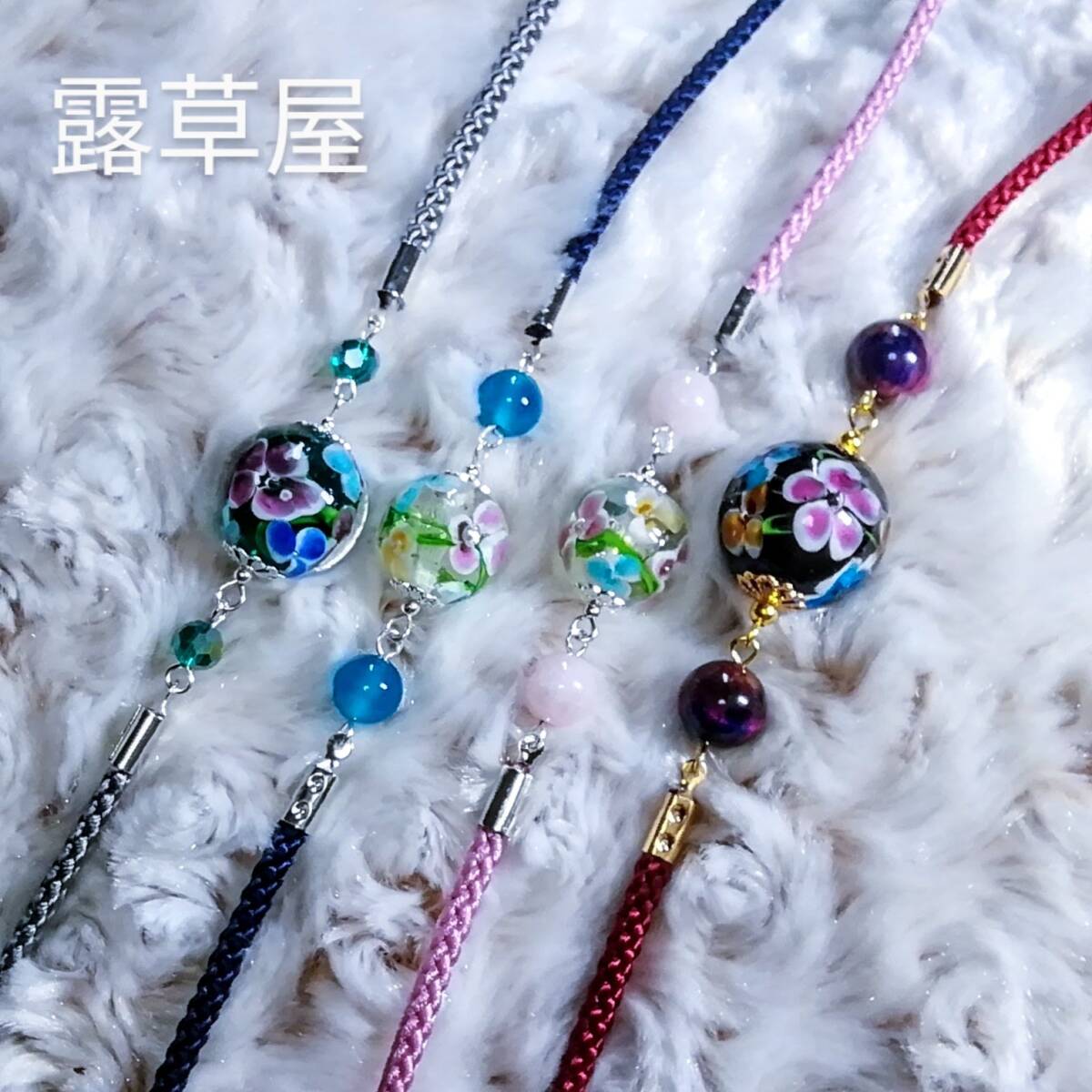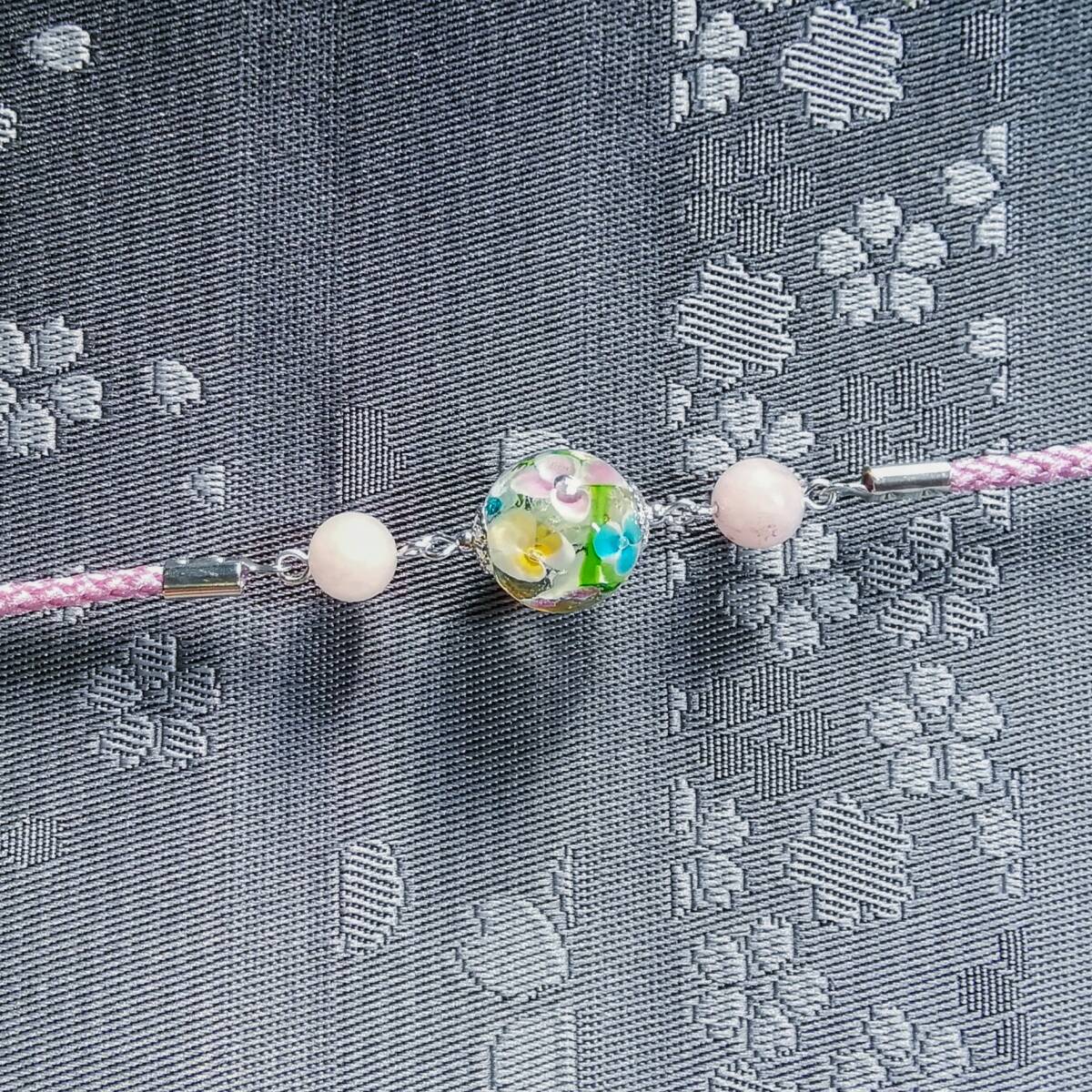 紐の太さは4mm、とんぼ玉(約16mm)、ローズクオーツ(8mmラウンド)、ガラスパーツを使用してあります。紐部分は退紅色(くすみピンク)、とんぼ玉は地色がクリアに花模様が入っております。