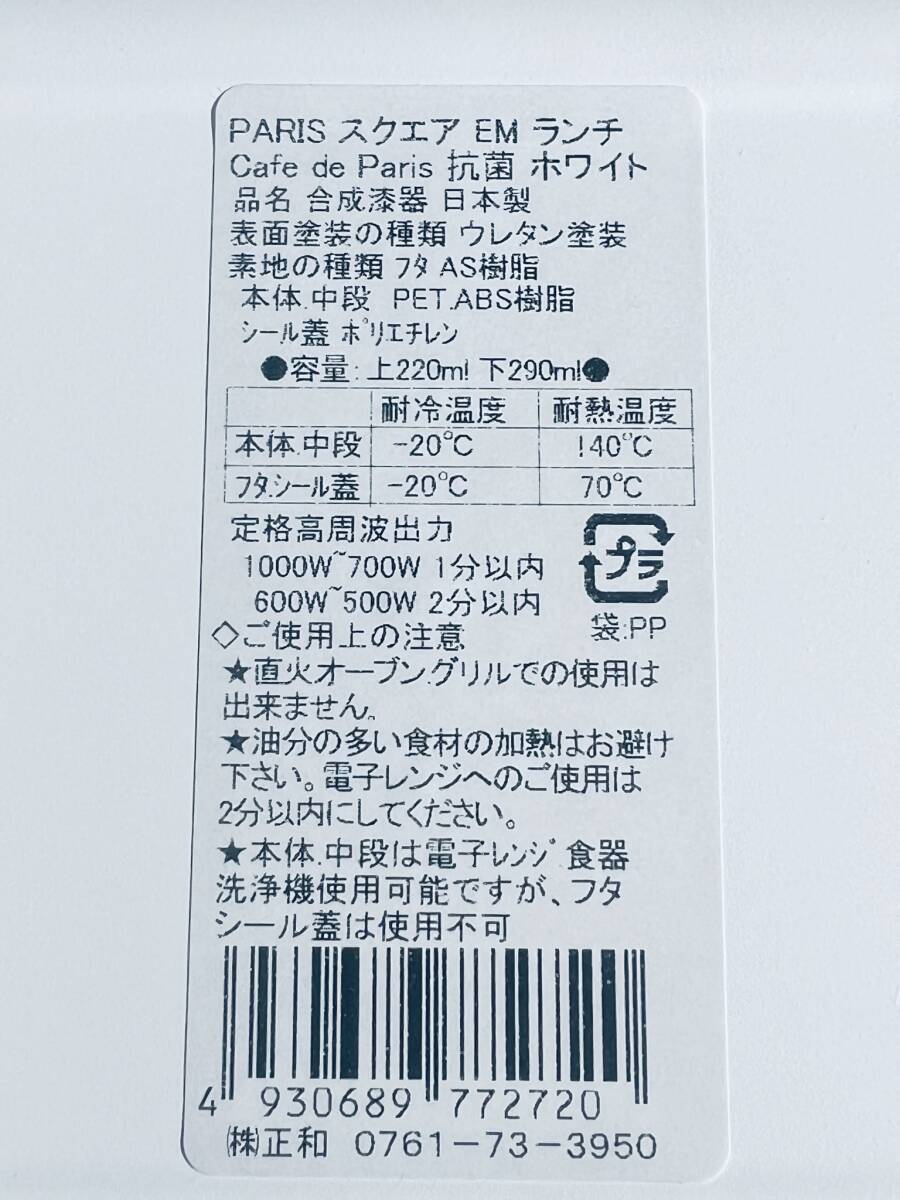 日本製 正成 【PARIS スクエア EM ランチ ボックス Cafe de Paris 抗菌 ホワイト】 可愛いお弁当箱 保冷剤付 子供 女性 重箱 2段 訳有り