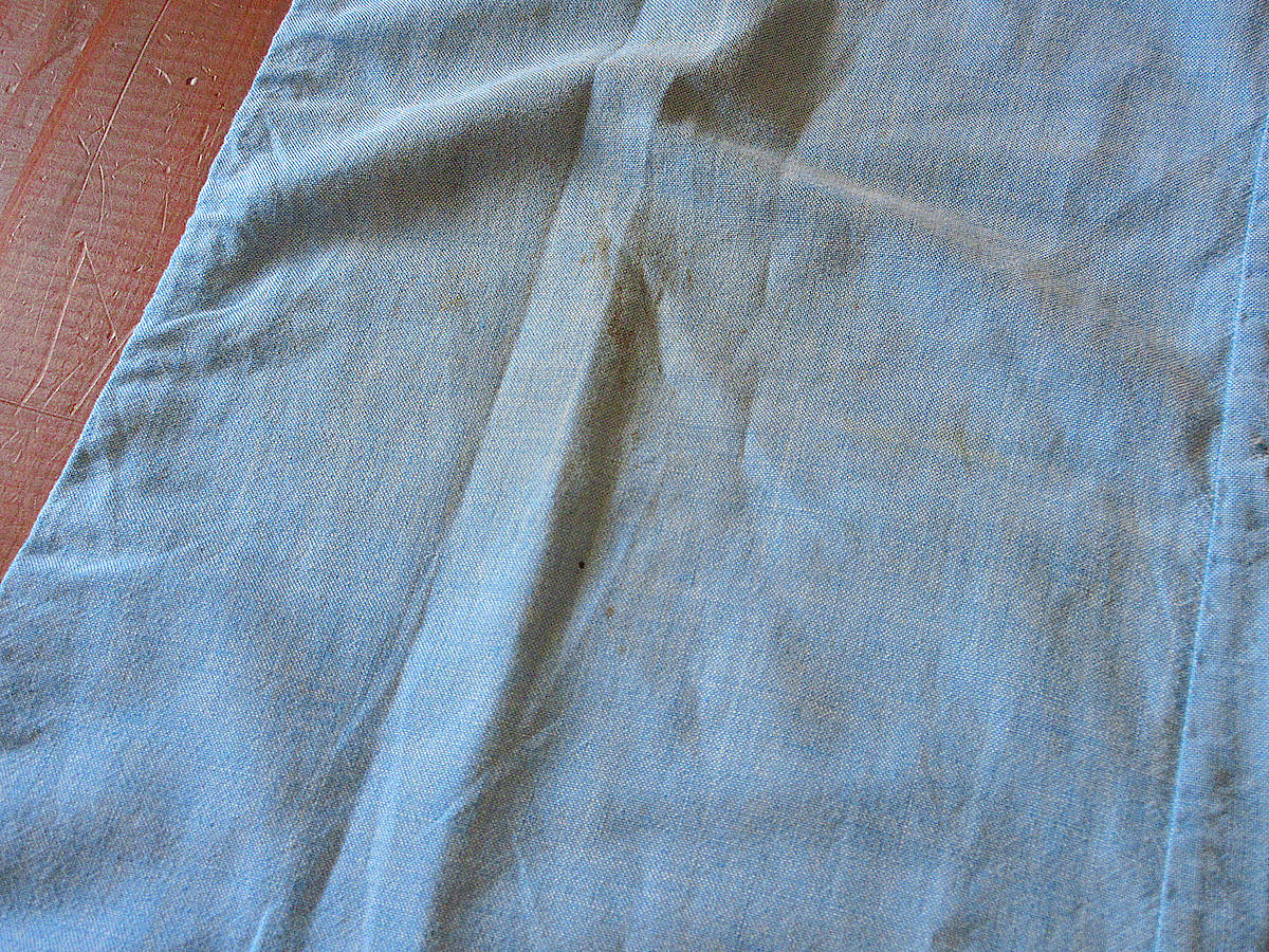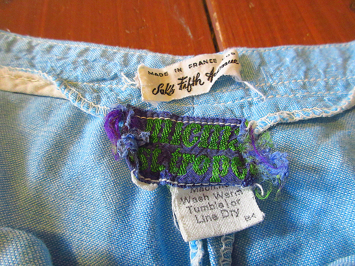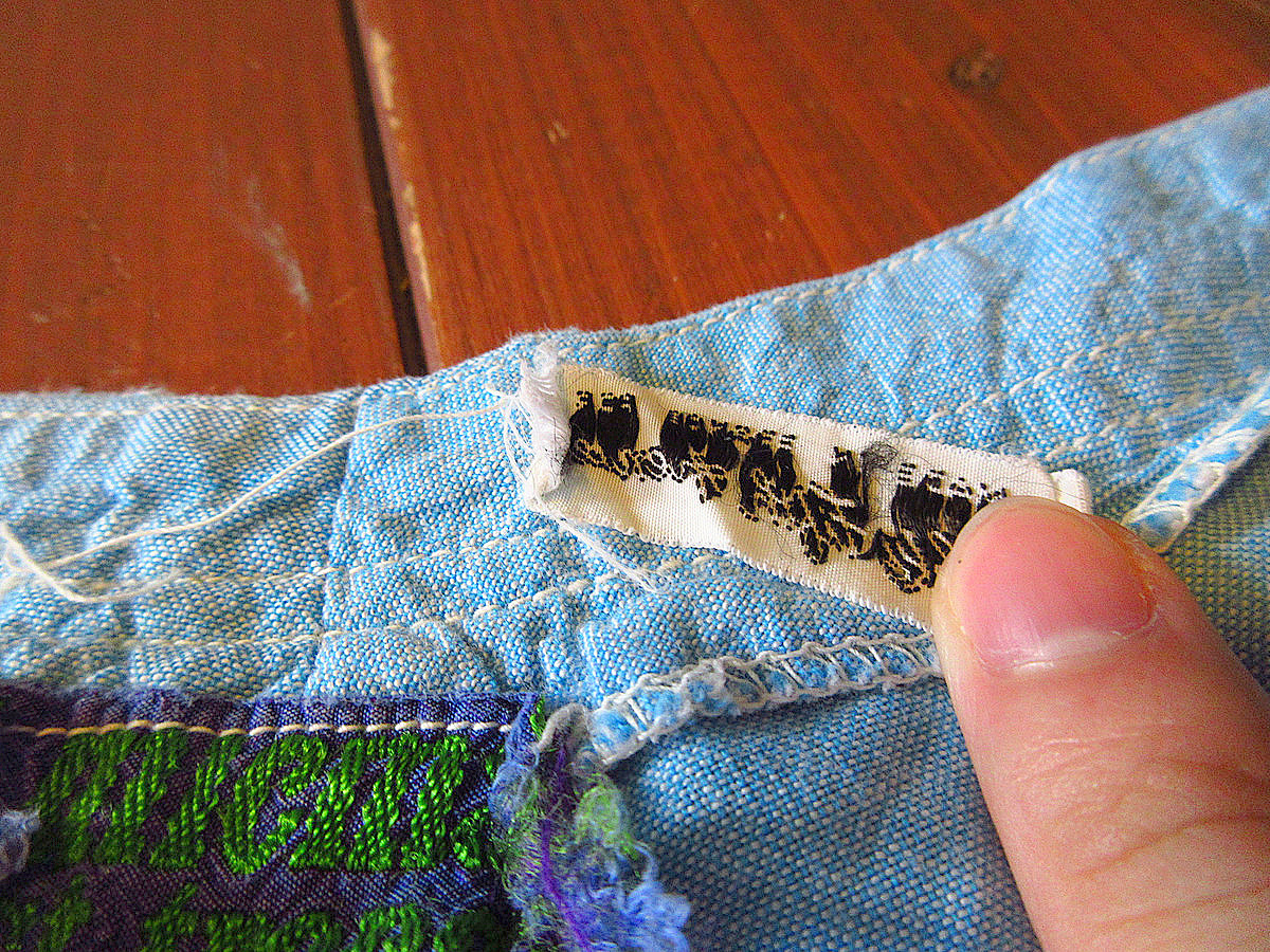 点々と汚れやシミあり、タグが取れかかっています。ステッチのホツレている箇所あり
