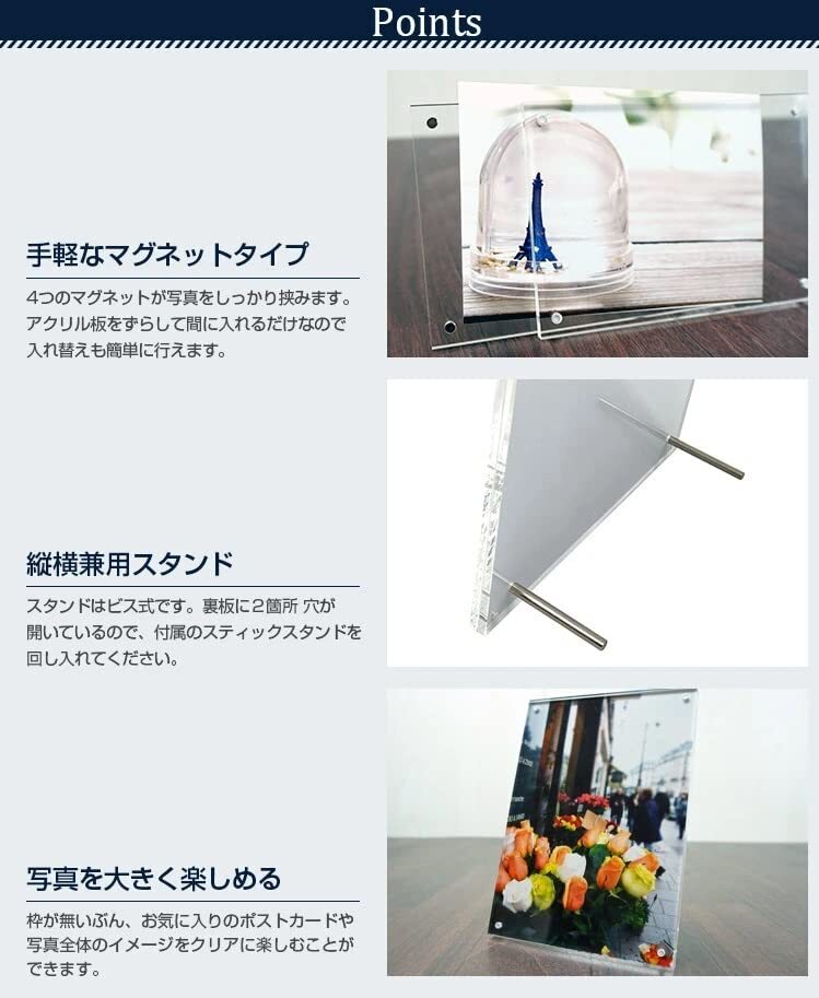 「万丈 VANJOH フォトフレーム アクリルフレーム サム A4判 100554 [マグネット式 タテ・ヨコ兼用]」▼4950486455855▼(商品説明)・透明 A4判 AS-A4・・Size:A4判・外寸:210×297×8mm・内寸:210×297mm・重量:640g・パッケージ:キャラメル箱(白箱)・縦・横兼用 置きのみ説明 透明感で写真をぐっと引き立たせるアクリルフレームです。 アクリルをずらして挟むだけなので写真の入れ替えがカンタンです。 スタイリッシュなスティックのスタンドは、ネジ式です。