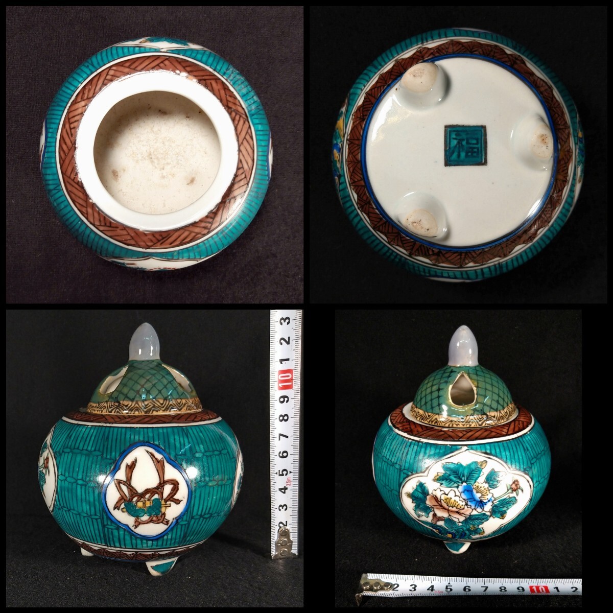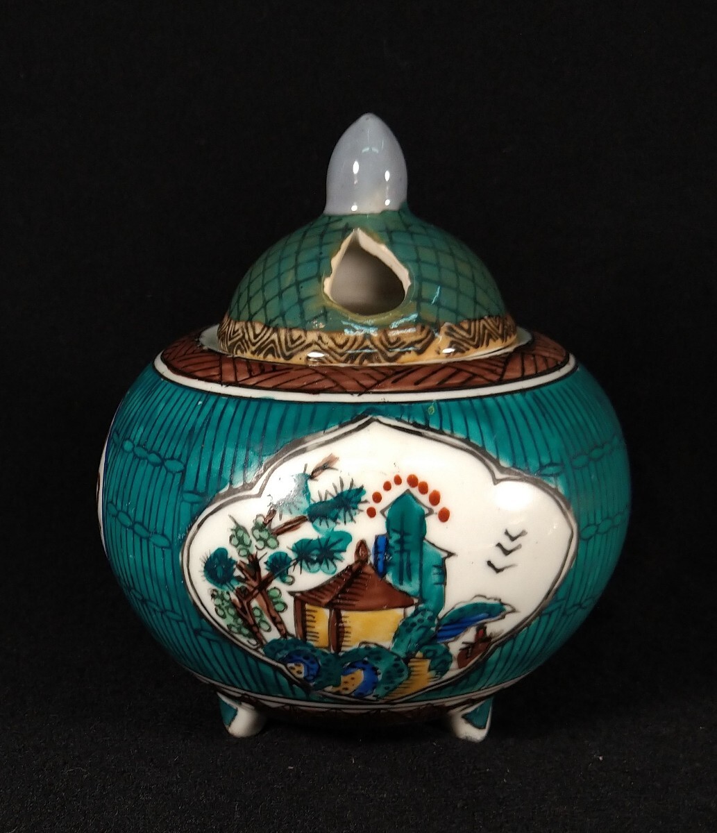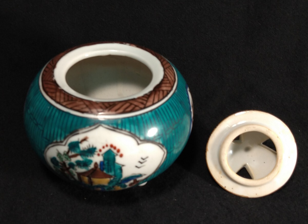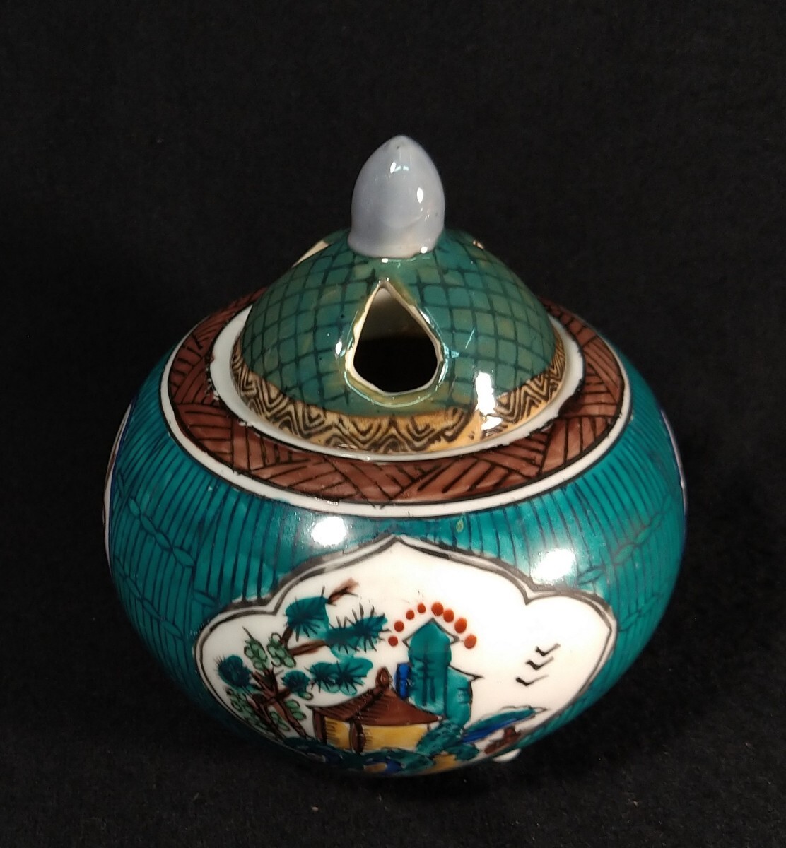 山水に花文が描かれた美しい香炉でございます。素人採寸で申し訳ございませんが、径11.5cm、高さ13.8cmでございます。