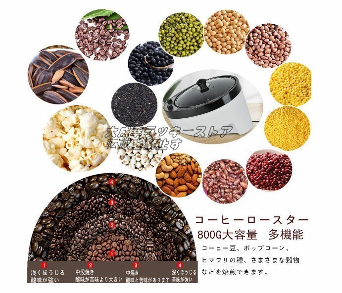 多機能大容量コーヒーロースター: 大容量800G、ハイパワー1800W。高効率、高速加熱、 攪拌均一。それはコーヒー豆、ポップコーン 豆、ひまわりの種、穀物、ナッツ、ピーナッツなどを焼くことができます。