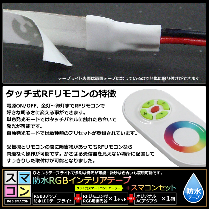 | テープライト1本に3つの光源(赤・緑・青)を装備しているので、様々な色合いの発光が可能です。 テープライトを使ってみたいけど特定の色を選ぶのが難しい・・・。 という方は多色発光可能のRGBテープライトを選び 雰囲気やシチュエーションに合わせて色合いを変えてみてはいかがでしょうか。 ご購入後すぐにご利用いただけるようRGBテープライトに調光器(コントローラー/RFリモコン付)とACアダプターをセットにした商品です。 道具を必要とする接続は当社で行ってから出荷しますので、お客様はジョイント部分を繋ぐだけで接続が可能です。 |