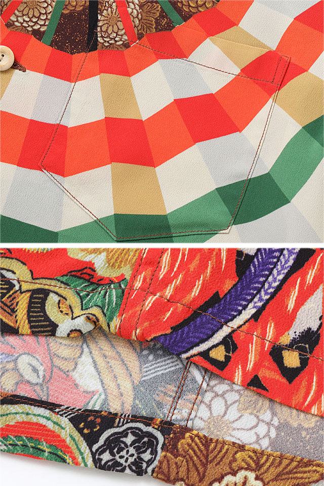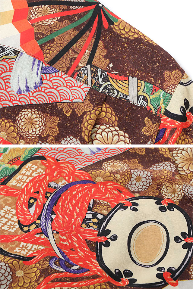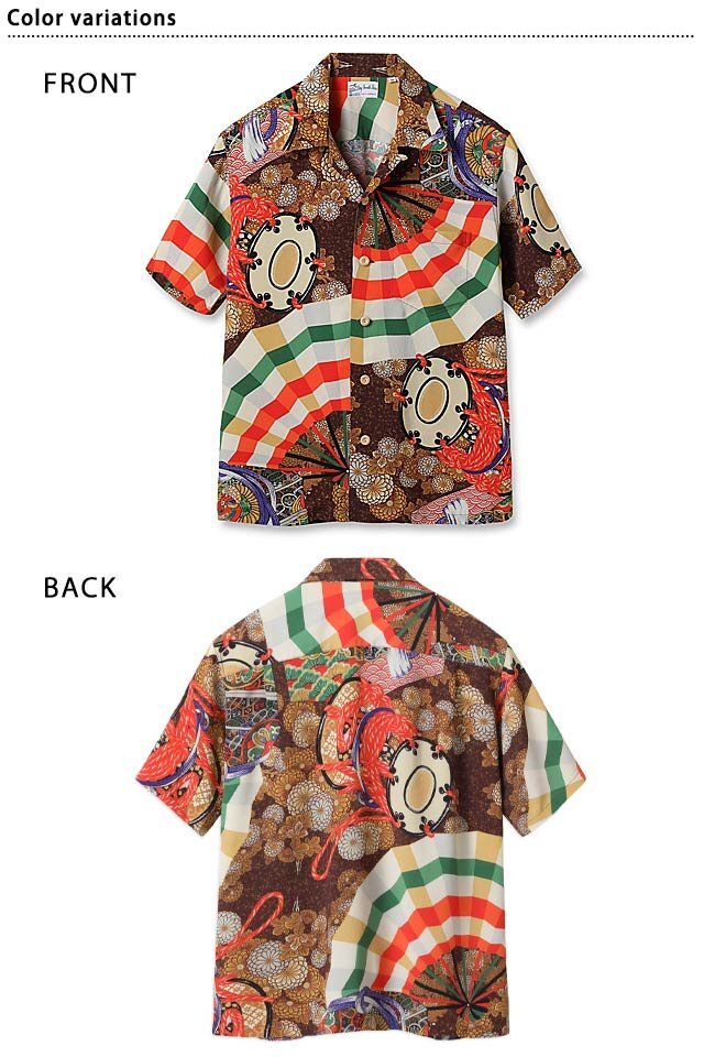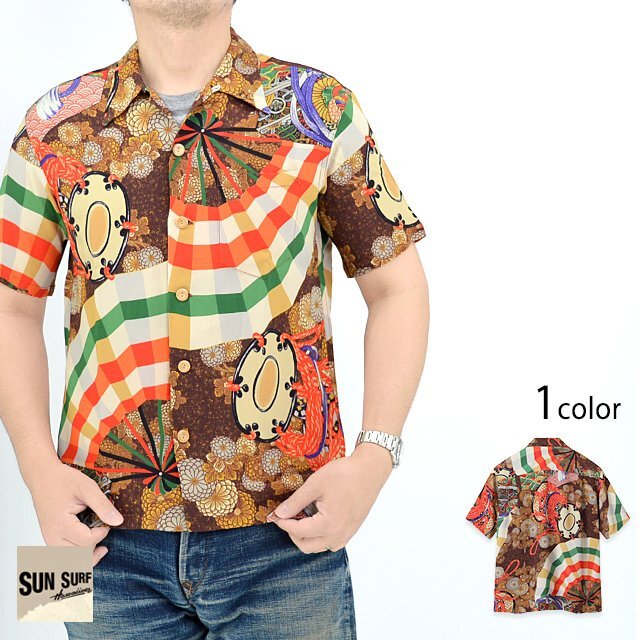 アロハシャツの黄金時代とされる1930~50年代にかけて作られた「ヴィンテージ」と呼ばれる貴重なアロハシャツを再現し、現代に蘇らせているブランド「SUN SURF」から、SPECIAL EDITION レーヨンアロハシャツ「MIKAGURA」(SS39271)のご紹介です。 日本に古くから伝わる神事のひとつに、御神楽(みかぐら)と呼ばれる神に奉納するための歌舞があります。 この作品は、御神楽で使われる扇子や鼓(つづみ)などが豪華に描かれた珍しいデザイン。 これらのモチーフは和柄のアロハシャツに度々使われますが、本作では鼓を縛るための調緒(しらべお)と呼ばれる麻で作られた紐を差し色のアクセントとし、華やかさが光る一枚となっています。 S・ハタ・ショーテンの経営者であった兄のサドノスケ・ハタと、子会社であるY・ハタ・カンパニーの創設者でハタ・ドライグッズ・ストアのオーナーであった弟のヨイチ・ハタ。 彼らは移民としてハワイへ渡り、兄弟で事業を成功させました。 日系生地コンバーターでもあったS・ハタ・ショーテンは、戦前から日本製の布地を扱っていました。 自社で築いた日本からの生地の流れを使い、ハタ・ドライグッズ・ストアでは多くの印象的な和柄を展開。 同社は卸売の割合が高かったことから生産数も少なかったため、現在ではオリジナルが見つかる機会が極めて少なくなっています。 それ故、希少性が高く、ヴィンテージ市場でも高額で取引されることが当たり前となっています。 ボディーには、てろんとしたレーヨン壁縮緬を採用。 | ||||||||||||||||||||||||||||||