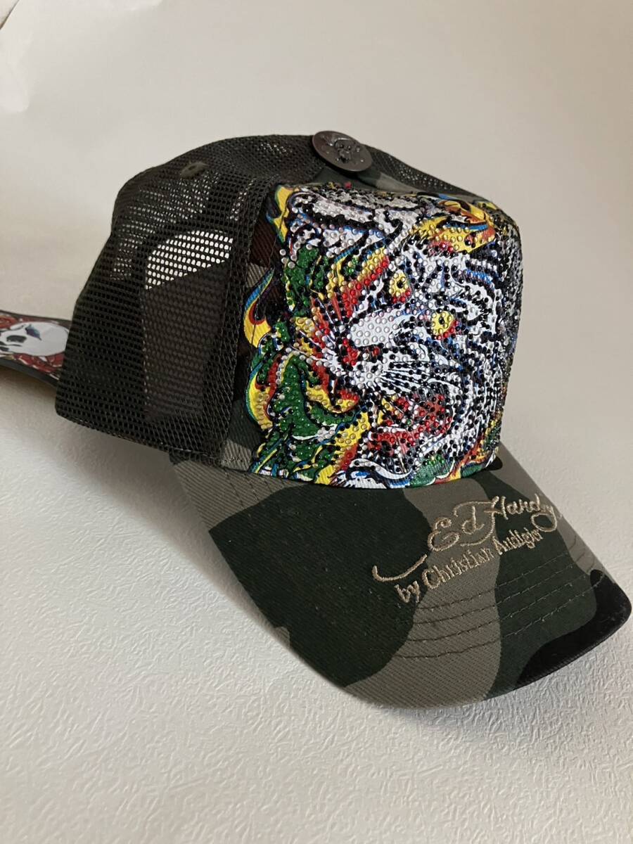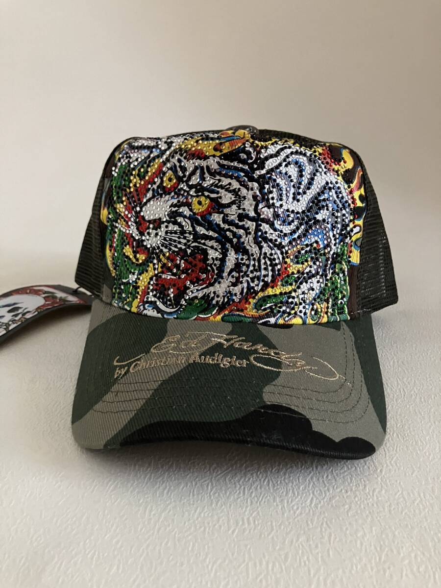 【新品未使用、正規品、本物】 Ed Hardy エド・ハーディー ラインストーン トラ 虎 タイガー 刺繍 キャップ 帽子 迷彩柄 カモフラージュ