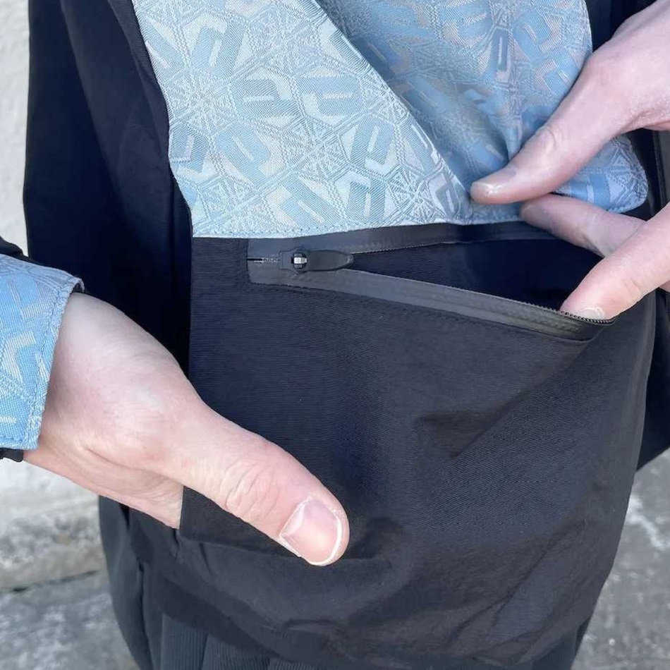 左袖口にはコラボレーションタグ。生地は撥水加工したナイロン生地と止水ファスナーを使用