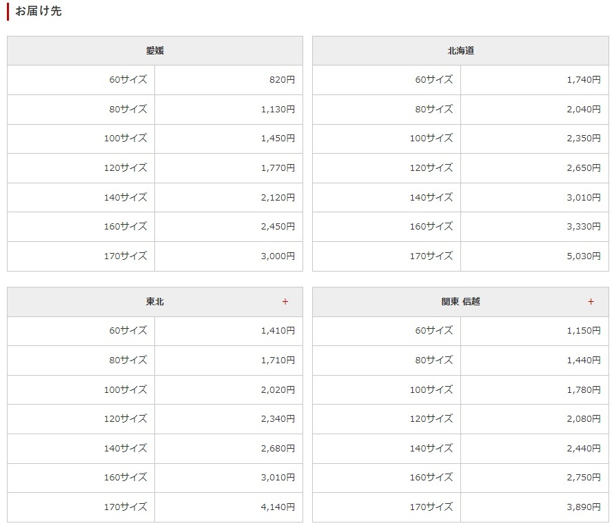请参考商品网页上的说明,若无说明,一般普通3KG左右的普通件700日元左右,超大件2000日元至1万日元不等。下单前有疑问的请咨询客服。