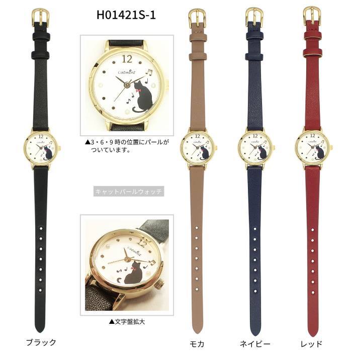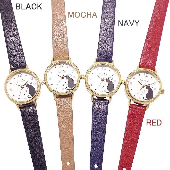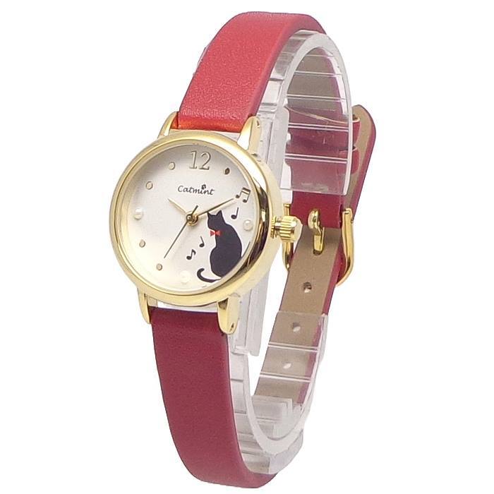 | ネコをモチーフとした可愛いデザインのウォッチです♪ 音楽を楽しむネコのシルエットが遊び心をくすぐるキュートな腕時計です♪ 小ぶりのケースと3・6・9時の位置のインデックス部分のさりげないパールが上品なデザインをまとめてくれています♪ 黒ネコがこちらを振り向き、かわいいです |