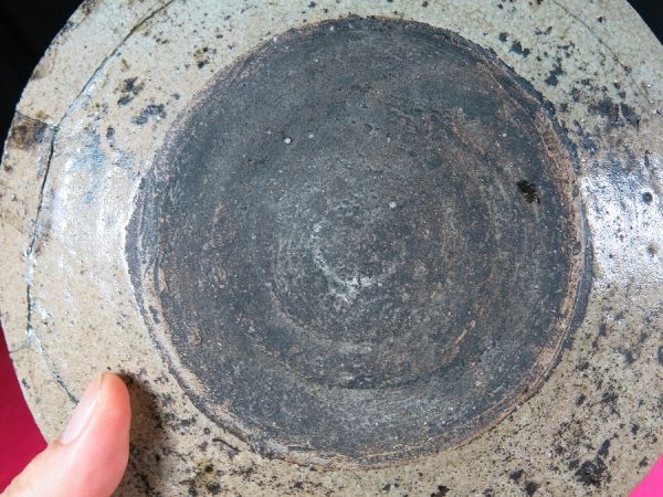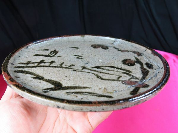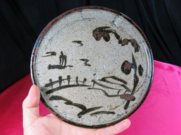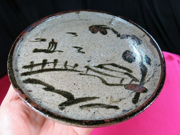 古瀬戸沖舟松家屋図鉄絵行灯皿  江戸時代 瀬戸 陶器