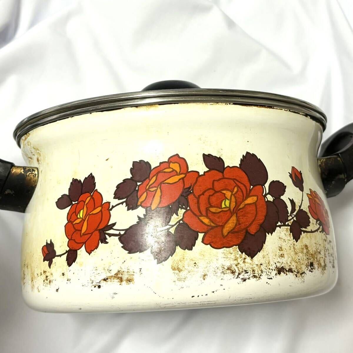 昭和レトロな薔薇の絵柄のホーロー両手鍋、