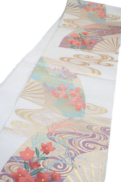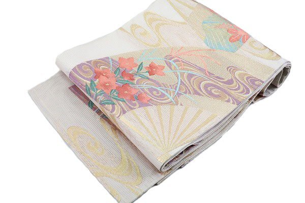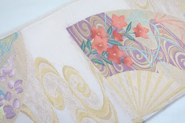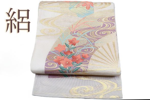 | 【送料無料】袋帯 夏帯 絽 ややベージュがかったグレー 扇面 桔梗 琳派 長さ4m26㎝ お洒落 正絹 仕立て上がり m-6140 |