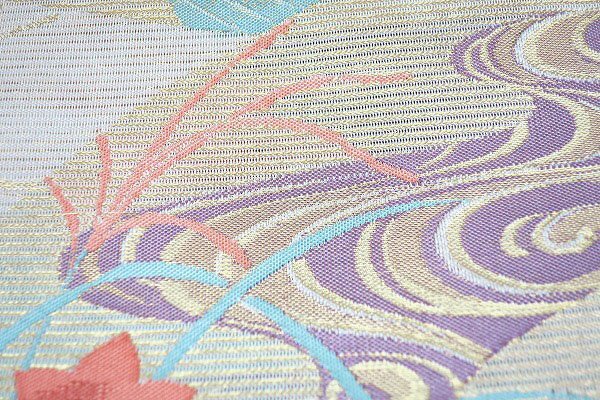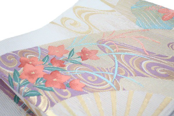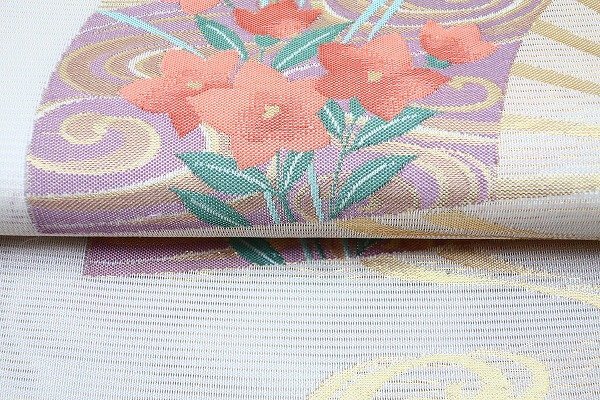 ややベージュがかったグレーの絽織地に、扇面に桔梗、琳派紋が織り込まれた絽の袋帯です。 |
