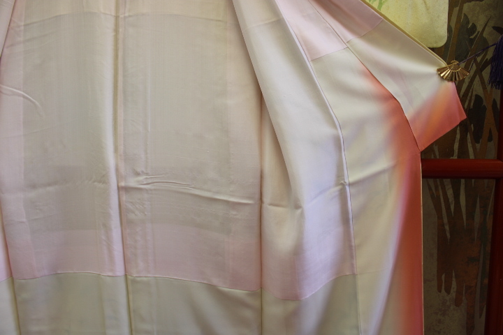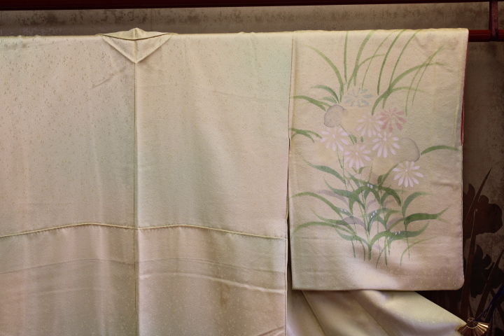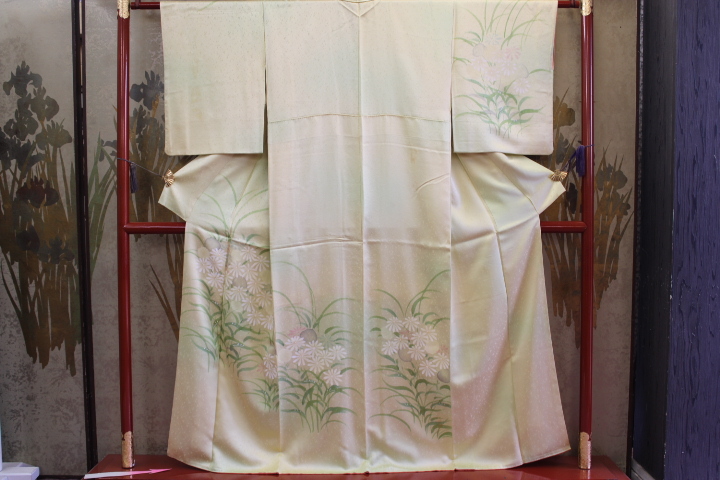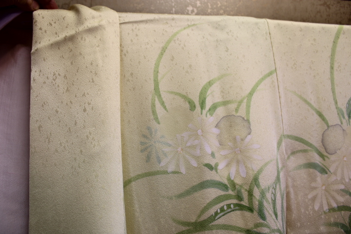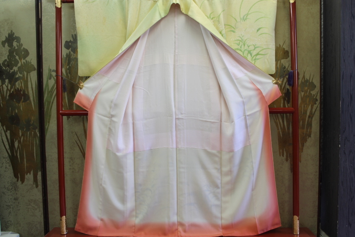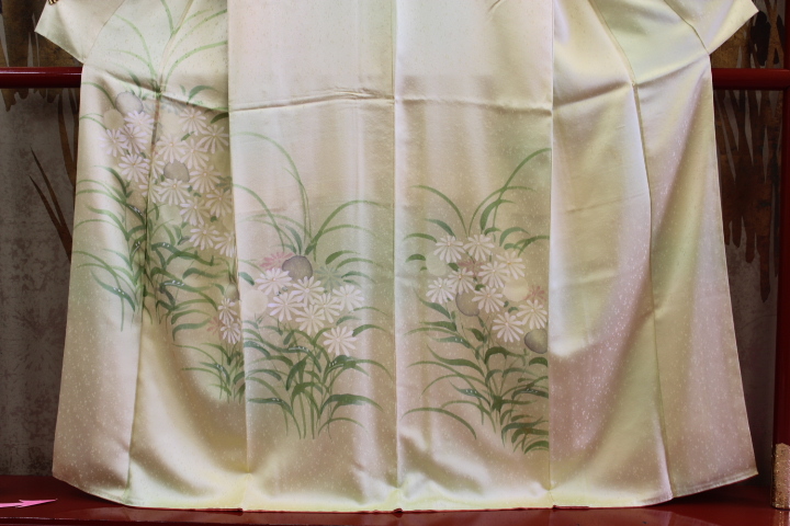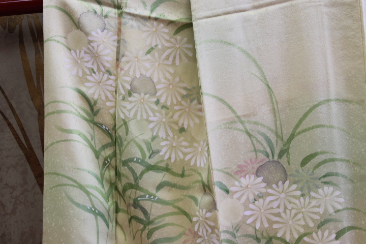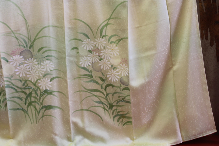 正絹高級綸子地 クリームと若草色ボカシ地に緑の草に白の花柄