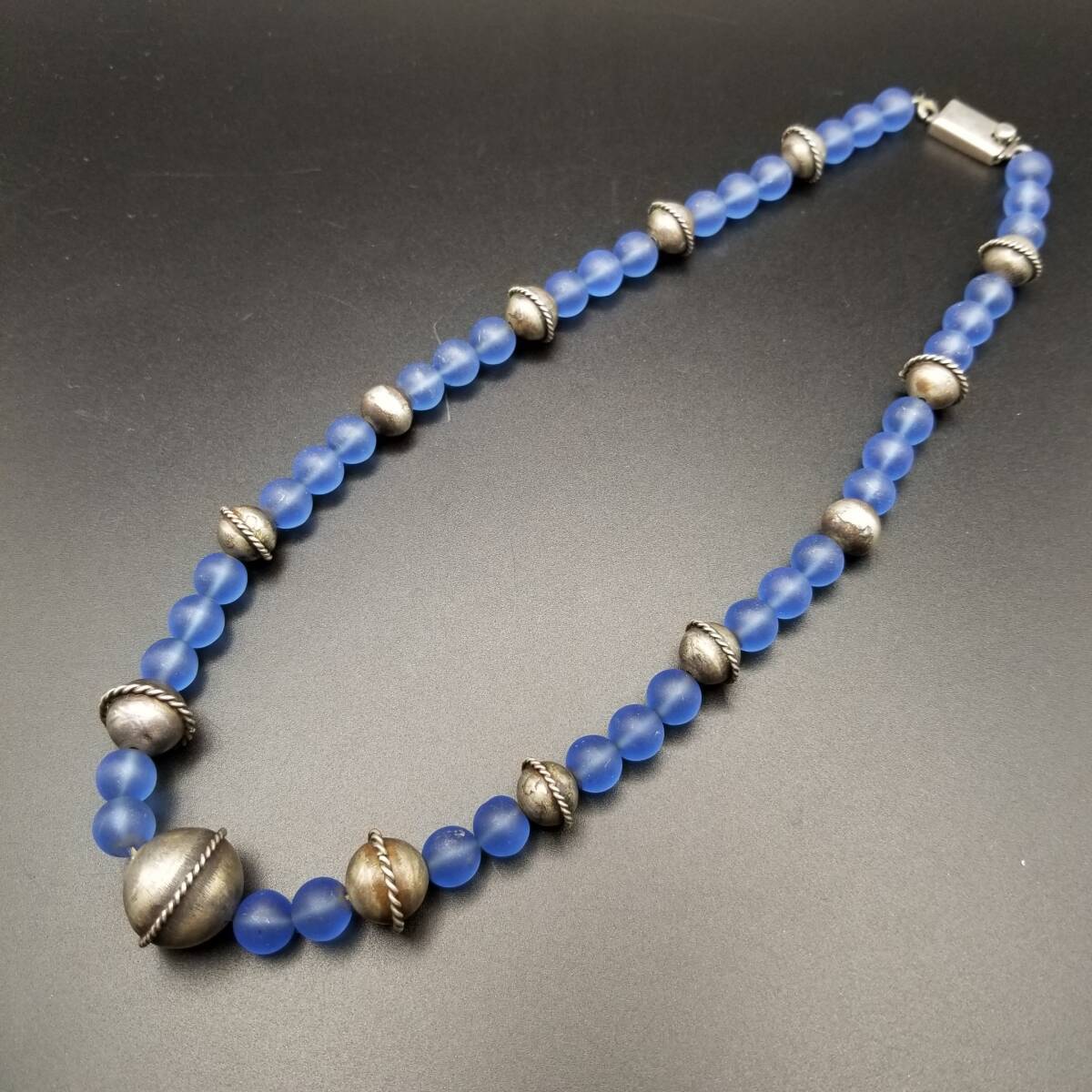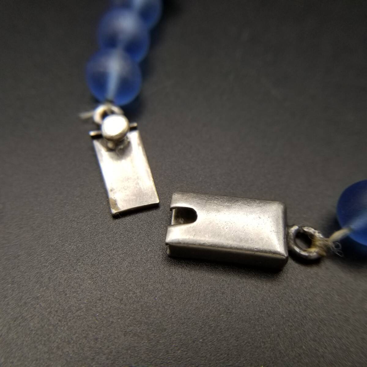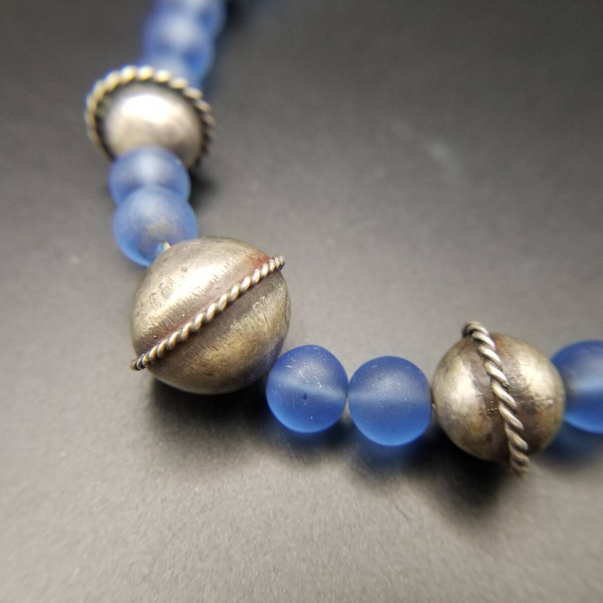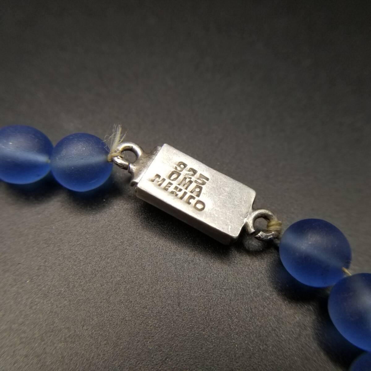 OMA メキシコ 925 シルバー 青い磨りガラス ビーズ 数珠 ヴィンテージ ペンダント ネックレス ボールチャーム 鮮やかなブルー Y16-V