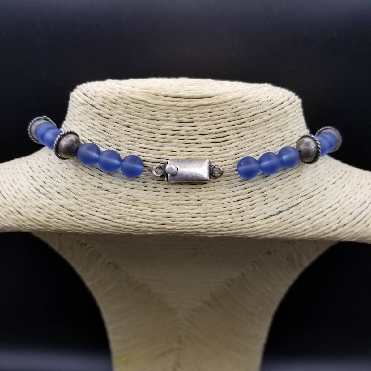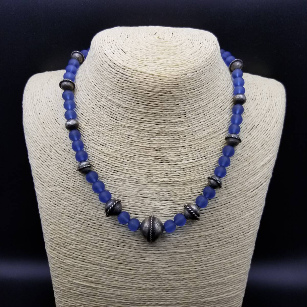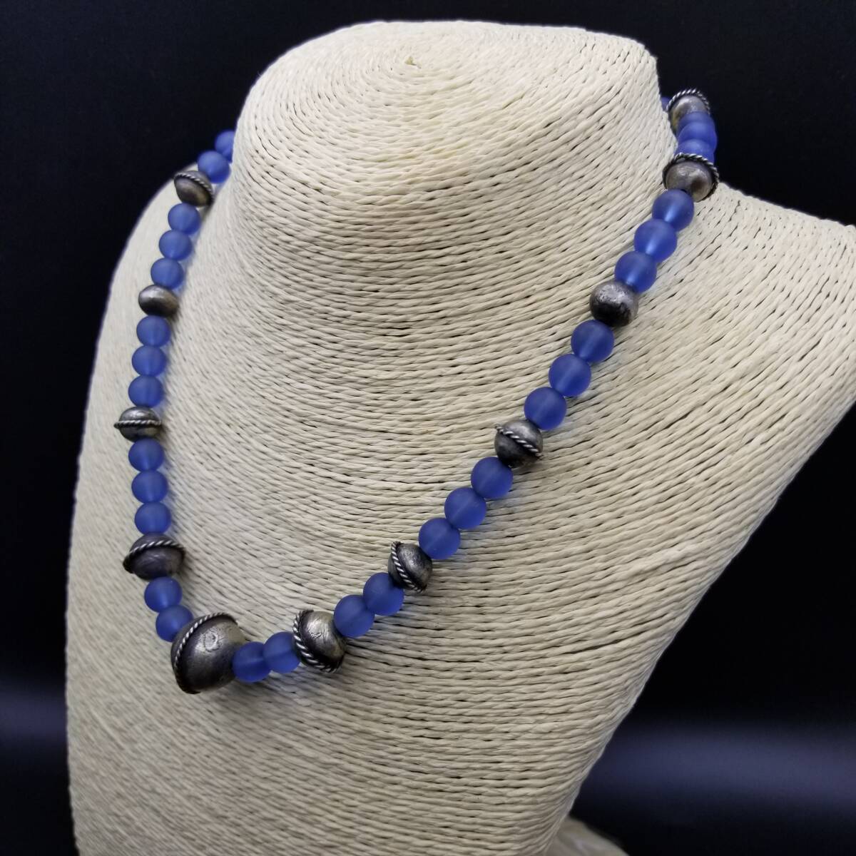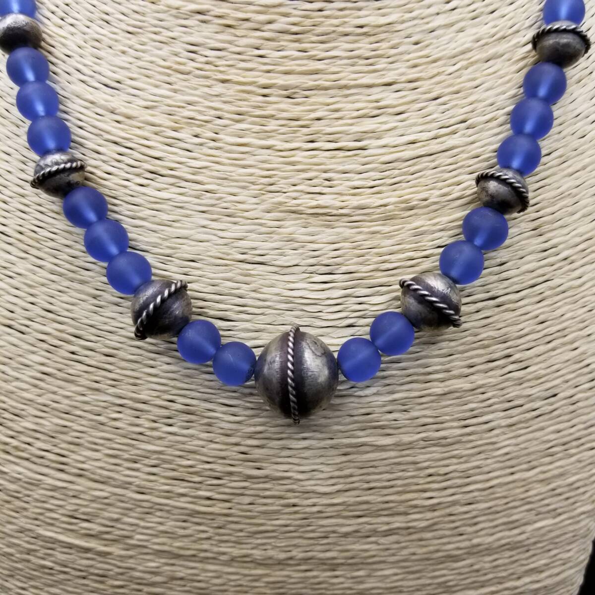 OMA メキシコ 925 シルバー 青い磨りガラス ビーズ 数珠 ヴィンテージ ペンダント ネックレス ボールチャーム 鮮やかなブルー Y16-V