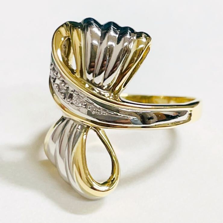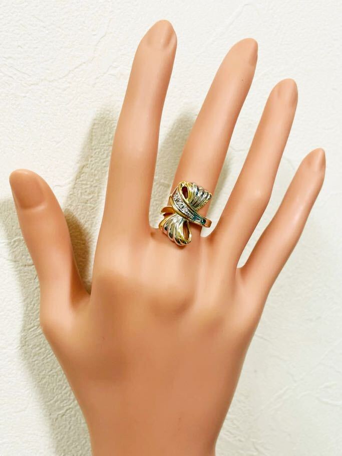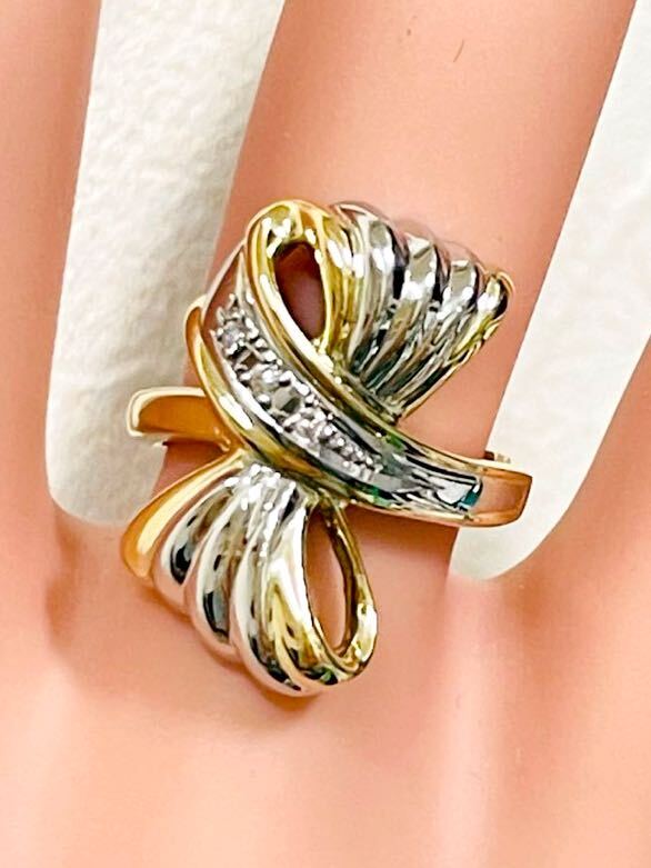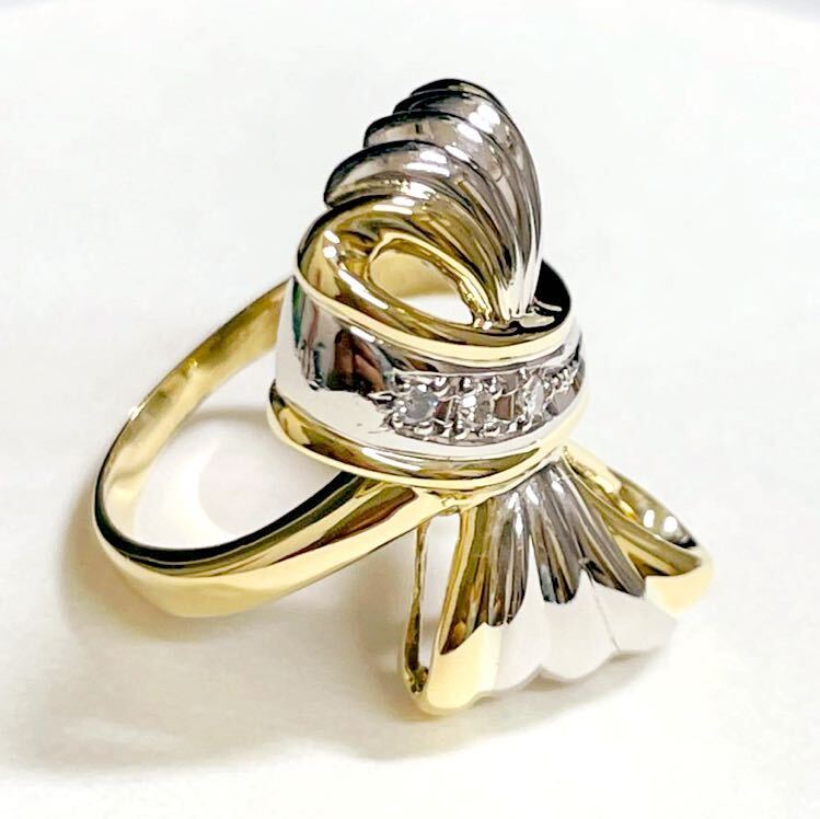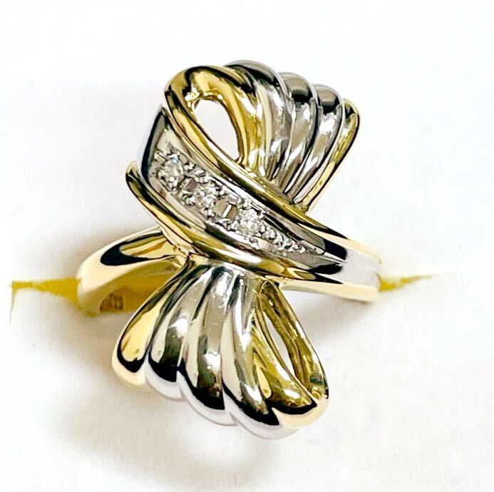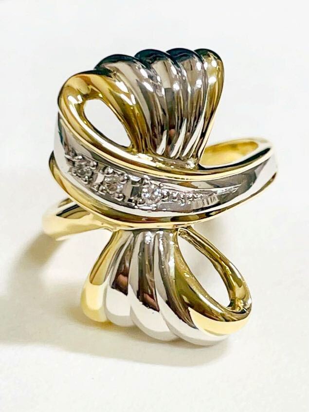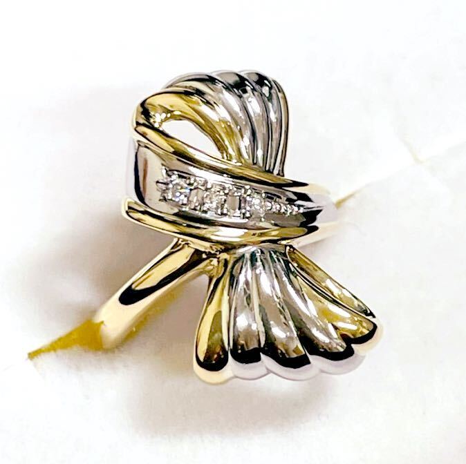 こちらは、K18/Pt900台にダイヤ3石付きリボンデザインリングです。