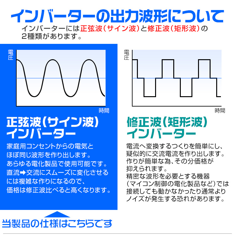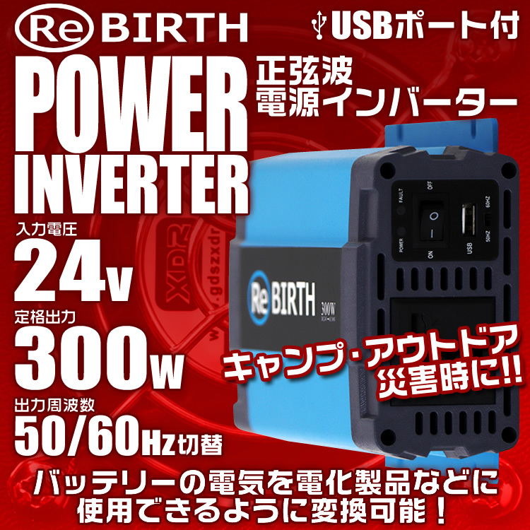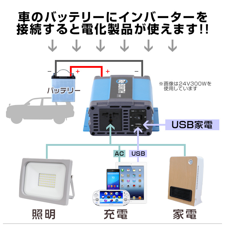 車内でデジカメやビデオカメラなどのAC電源と、 iPhoneやスマホ、iPad充電対応のUSB電源がとれる300Wのカーインバーターです。 バッテリーの直流24Vを交流100Vに変換!正弦波でより安定した100Vを供給します。 差し込み口は、ACコンセント1つとUSBポート1つの計2つの差し込み口を装備しています。 8つの安心・安全機能付き!! インバーター本体と接続した機器を危険から守ります! キャンピングカーや車内泊、車外での作業や照明、充電など様々な用途にお使いいただけます。 防災グッズとして停電時の電源確保に役立ちます!! ■商品コード:C17B ■商品仕様 入力電圧:DC24V 出力電圧:AC100V 定格出力:300W 出力周波数:50Hz/60Hz切替 出力仕様:ACコンセント(1口)、USBポート(1口) 出力波形:正弦波 USB出力:DC5.1V/1.0A 使用温度環境:0℃~40℃ 本体サイズ(約):205mm×145mm×65mm 重量(約):790g ■商品機能 入力低電圧警報音 入力過電圧保護 入力逆接続保護機能 低電圧遮断 過温度遮断 過負荷遮断 回路保護 短絡遮断 ■内容 インバーター本体 ×1 バッテリー接続コード ×2 日本版取扱説明書 ※USBケーブルは付属しておりません。 ■注意事項 ・電圧(12V/24V)はお間違いのないようご確認お願いいたします。 ・商品は、モニターによって色合いが異なって見える場合があります。 ・仕様・デザインは改良のため予告なく変更することがあります。 ■保障期間 7日間 ※商品到着後7日以内の初期不良・破損のみご対応させていただきます。 【新品未使用品です】 |