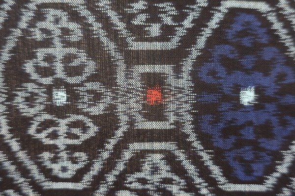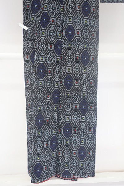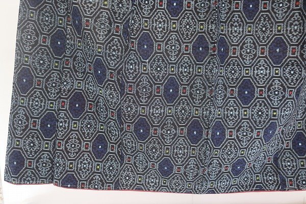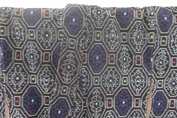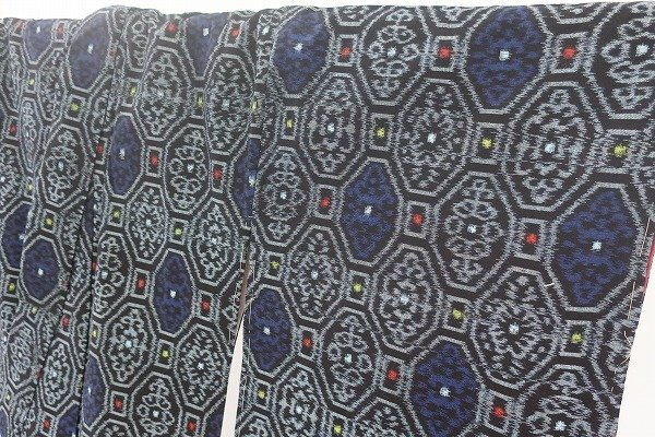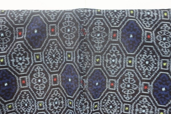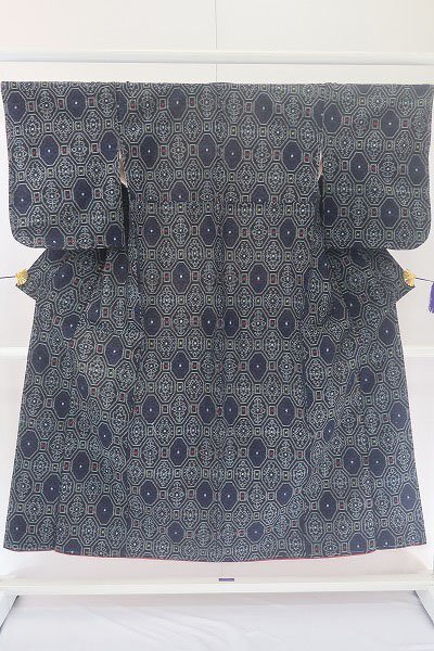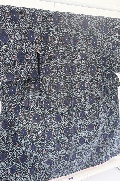 黒と水色の綿地に亀甲模様が織られた小紋です。 お手入れがしやすく、普段使いに便利な一枚です。 |