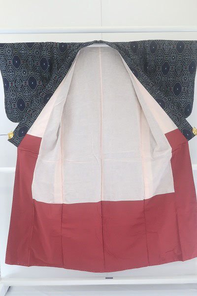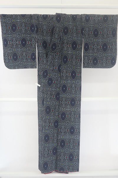 【着物フィ】美品 小紋 黒×水色 身丈147.5cm 綿 綿着物 亀甲模様 仕立て上がり 16420 |
