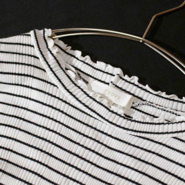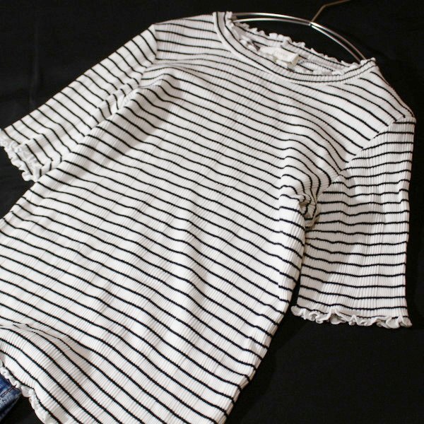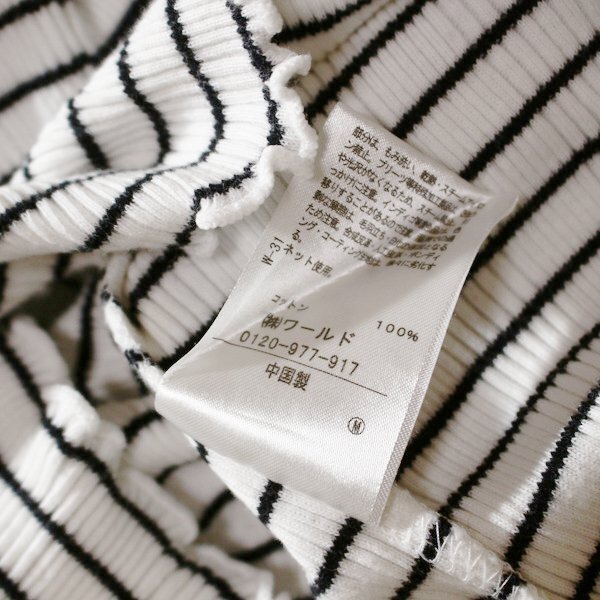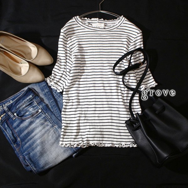 美品 (株)ワールド grove グローブ 可愛いボーダー柄 リブストレッチ コットン ニット プルオーバー M 春 夏 24C06