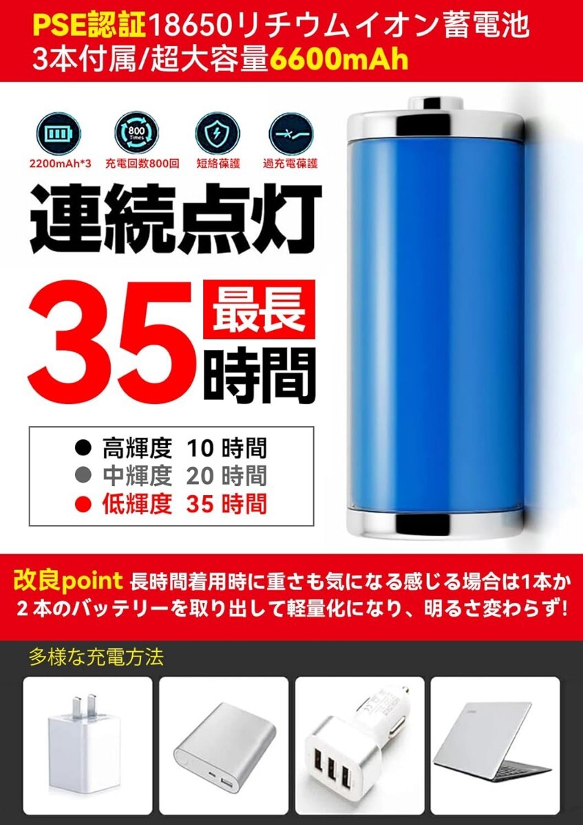 【Type-C急速充電+過充電保護+電力表示】超高輝度ヘッドライトには3つの大容量の充電可能な18650 バッテリーが付属しており、充電式ヘッドランプはType-C充電ケーブルで充電可能です、便利な充電。過充電保護ICが内蔵されています。 側面には4つの電源インジケータライトがあり、いつでもどこでも電力使用量を知ることができます。早めに充電するように通知します。また、長時間着用時に重さも気になる感じる場合は1本か2本のバッテリーを取り出して軽量化になり、明るさ変わらず!