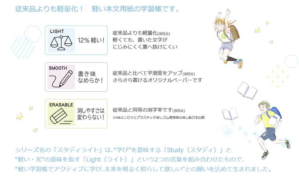 『スタディライト』シリーズは当社従来品に比べ、約 12%もノート本体が軽くなりました。従来品と比べ平滑度をアップし、さらさら書けるオリジナルペーパーを本文用紙に使用。軽くなっても消しやすさ・裏抜けしにくさは従来品そのままです。