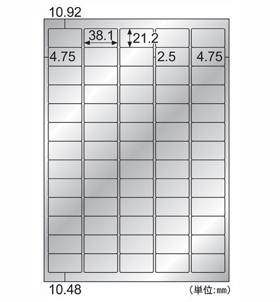 ・サイズ:A4 210X297mm ・ラベルサイズ:38.1×21.2mm ・面付け:65面(5x13) ・坪量:233g/m2程度 ・材質:シルバーPETフィルム