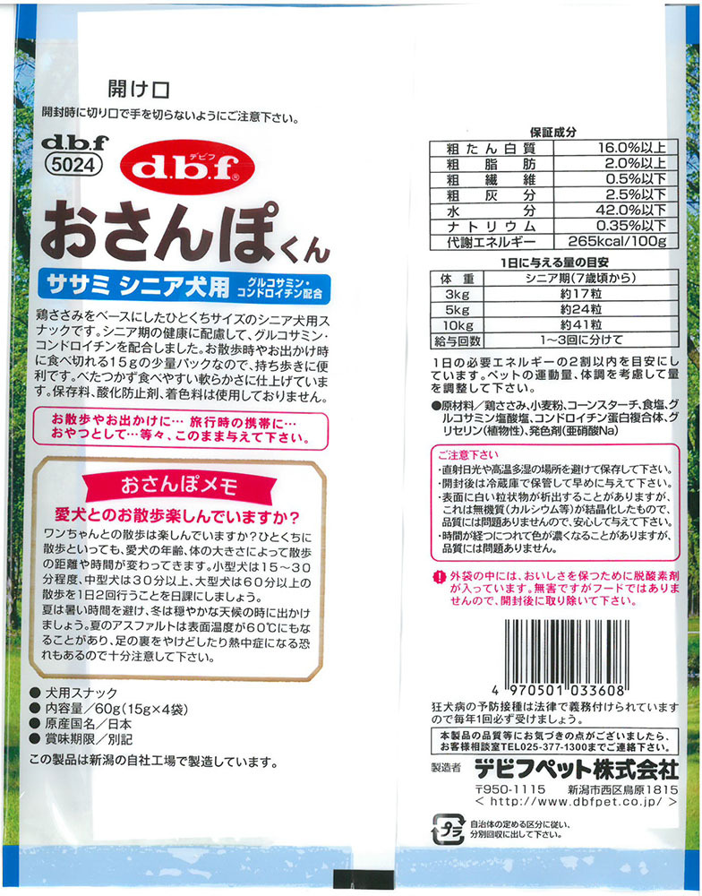 鶏ささみをベースにしたひとくちサイズの高齢犬用スナックです。高齢期の健康に配慮して、グルコサミン・コンドロイチンを配合しました。お散歩時やお出かけ時に食べ切れる15gの少量パックなので、持ち歩きに便利です。べたつかず食べやすいやわらかさに仕上げています。保存料、酸化防止剤、着色料は使用していません。