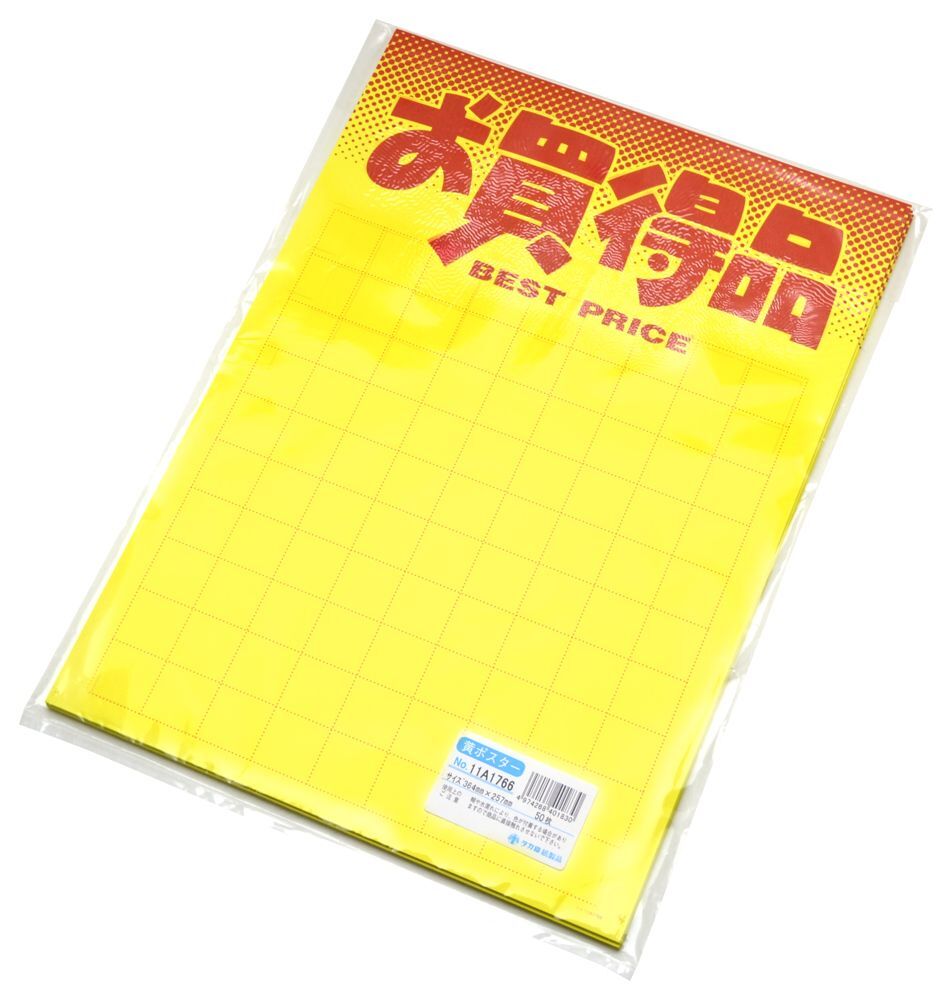 マス目入りで文字入れやカットがしやすく、全面黄色の用紙を使用し、文言が入っているので簡単にPOPを作ることができます。