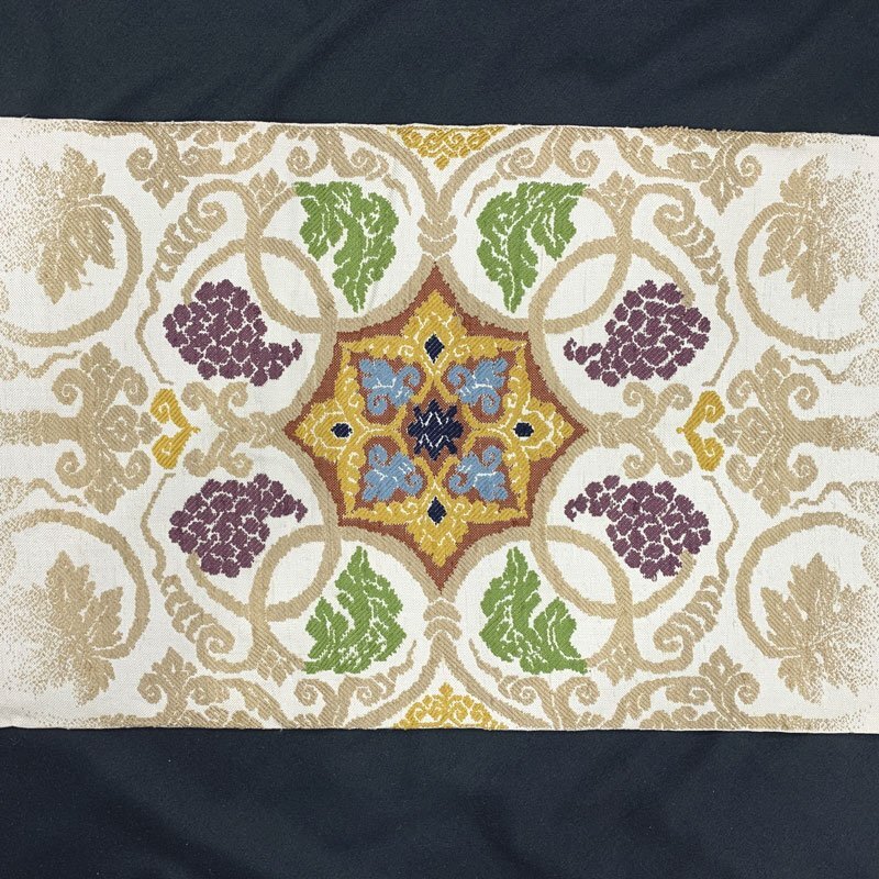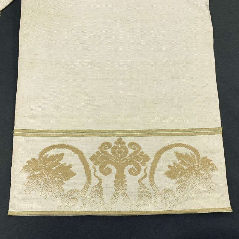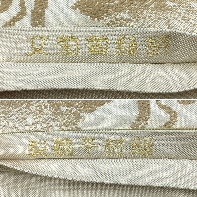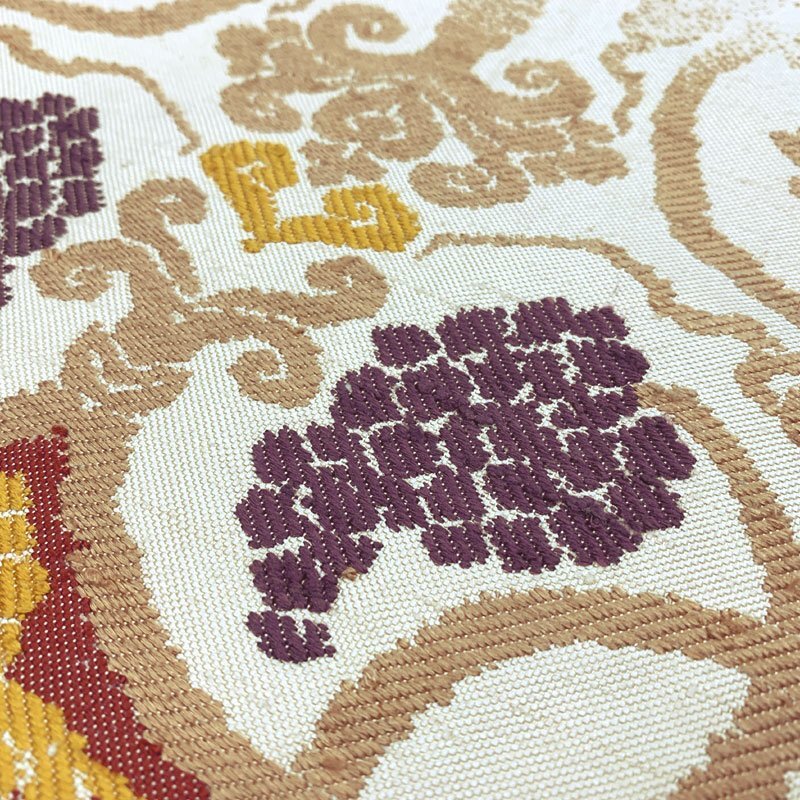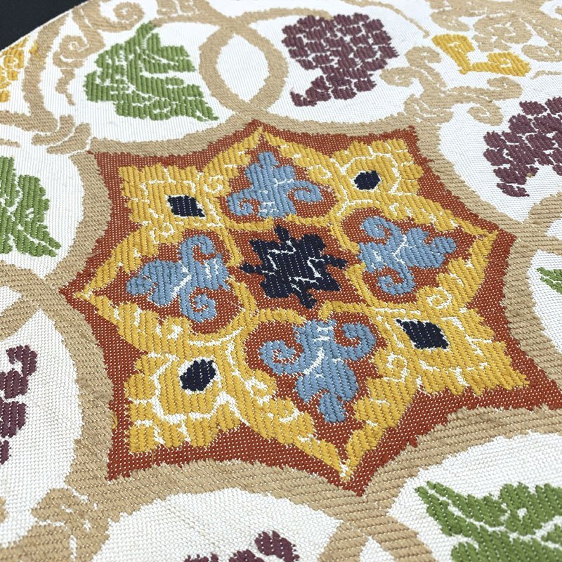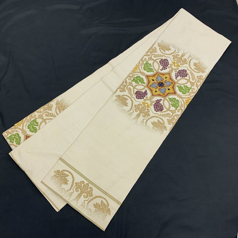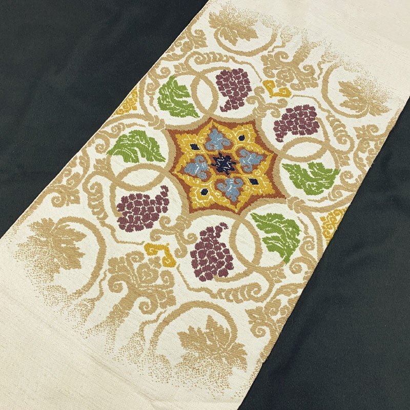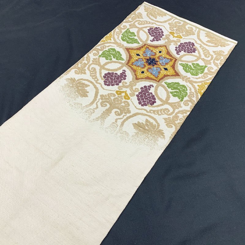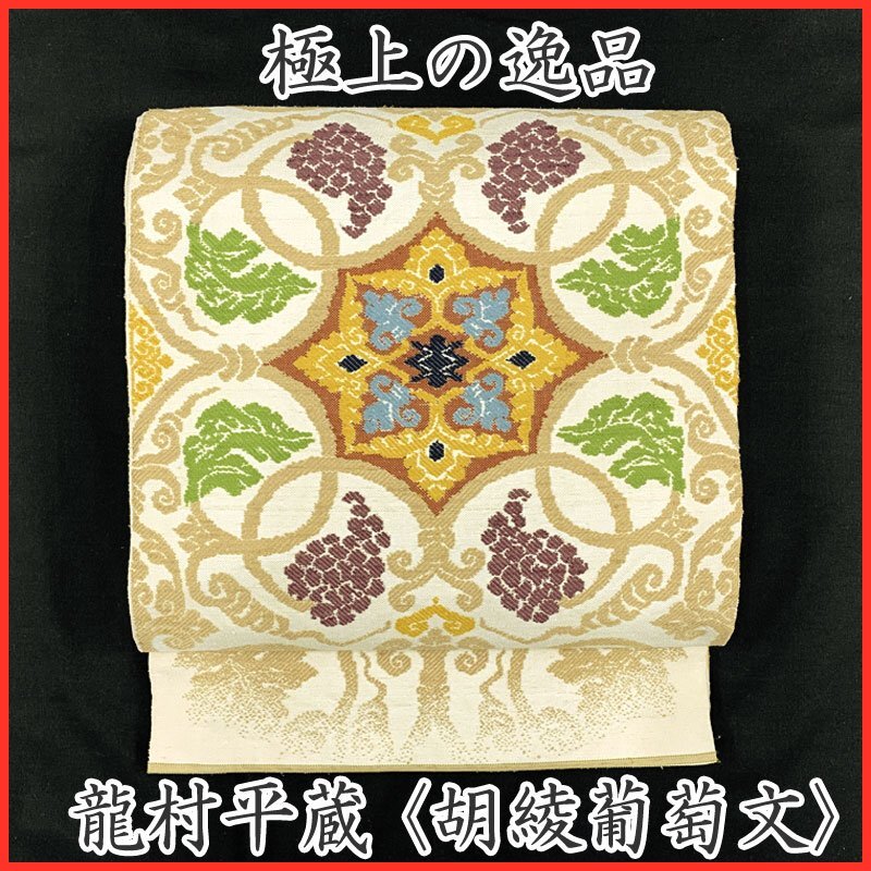 | ◇極上の逸品 龍村平蔵 葡萄 作家物 コレクション たつむら 本袋帯◇美品 (No.knd) 龍村平蔵製の紬地の本袋帯で、織り出しに「胡綾葡萄文」とあります。円を描くように外側へ広がり、葡萄の房や葉が中央の宝相華と合わさり色彩豊かです。金糸は入っておりませんが、照明が当たると明るく鮮やかな印象に。コレクションにもいかがでしょうか。 締め跡や使用感、各所に糸のけば立ちなどはございますが、特に目立つようなダメージもなく美品です。 【素材】正絹 【色】生成り *モニターによって色味は実際と異なる場合がございます。 【サイズ】幅:31cm、長さ:446cm *素人採寸のため、多少の誤差はご容赦ください。 上質な逸品ですので、いかがでしょうか?よいお品物でお勧めです^^ | |