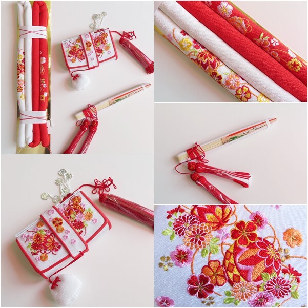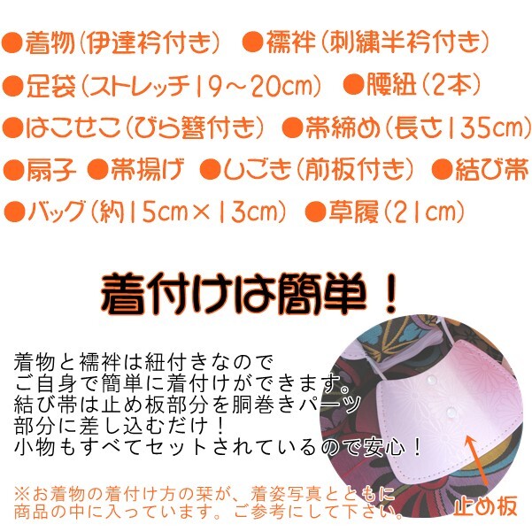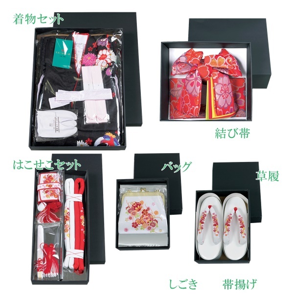 着物(伊達衿付)・襦袢(刺繍半衿付)・足袋(19~20cm)・腰紐(2本)・結び帯・帯揚げ・帯締め・ しごき・はこせこ・扇子・草履・バッグ