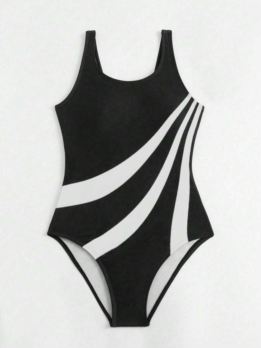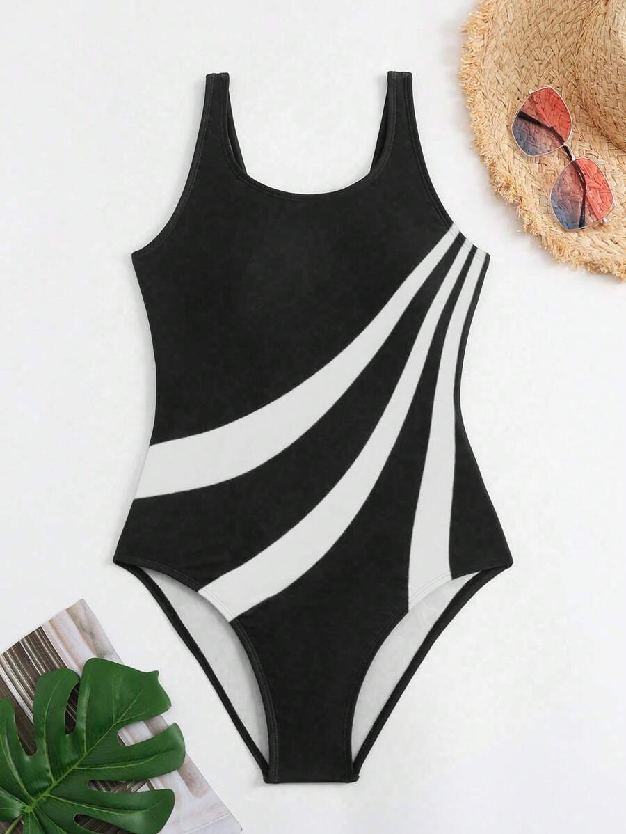 レディース 水着 ワンピース 女性用 カラーブロック ブラック&ホワイト ワンピース水着、夏のビーチ用ワンピース水着