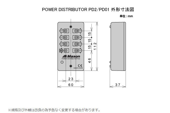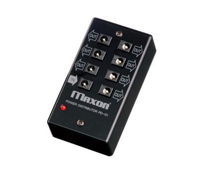 Maxonパワー・ディストリビューター「PD01」は、エフェクター専用のDC電源分配器です。付属のACアダプタから、7台までのエフェクターにDC電源を同時供給できます。ACアダプタに電圧安定回路を内蔵しています。常時安定した電源をエフェクターへ供給します。電源電圧の変動によるエフェクト効果の劣化や誤作動がありません。また、電源ノイズも抑えられます。合計でDC2000mAまでの電流を供給できます。電源ONのLEDインジケータを装備しています。「DC 9V」または「DC10V」のACアダプタで動作し、電源ジャックの極性が“センターがマイナス”、“スリーブがプラス”の他社エフェクターも同時に接続できます。(純日本製 / MADE IN JAPAN)※本機の各チャンネルはアイソレートされていません。予めご了承ください。<付属品> ACアダプター AC2009、接続コード(L=約45cm)×5本画像はサンプルです。日曜日の正午~月曜日(休業)オーダーの場合、ご案内連絡は火曜日となります。ご注文の際は以下の点をご確認ください。 ・商品出荷は、基本平日(火~金)です。(土、日、月曜日)のご注文は週明け火曜日以降となります。 ・「必ず*日までに欲しい」など、の場合やお急ぎの対応はいたしかねます、ご了承下さい。 ・発送は基本お支払い完了後5日以内に発送完了いたします。 《ご注意》 ・お支払いについて、銀行口座への振込みは出来ません。 口座送金希望の場合はキャンセルといたします。 くれぐれもご注意ください。