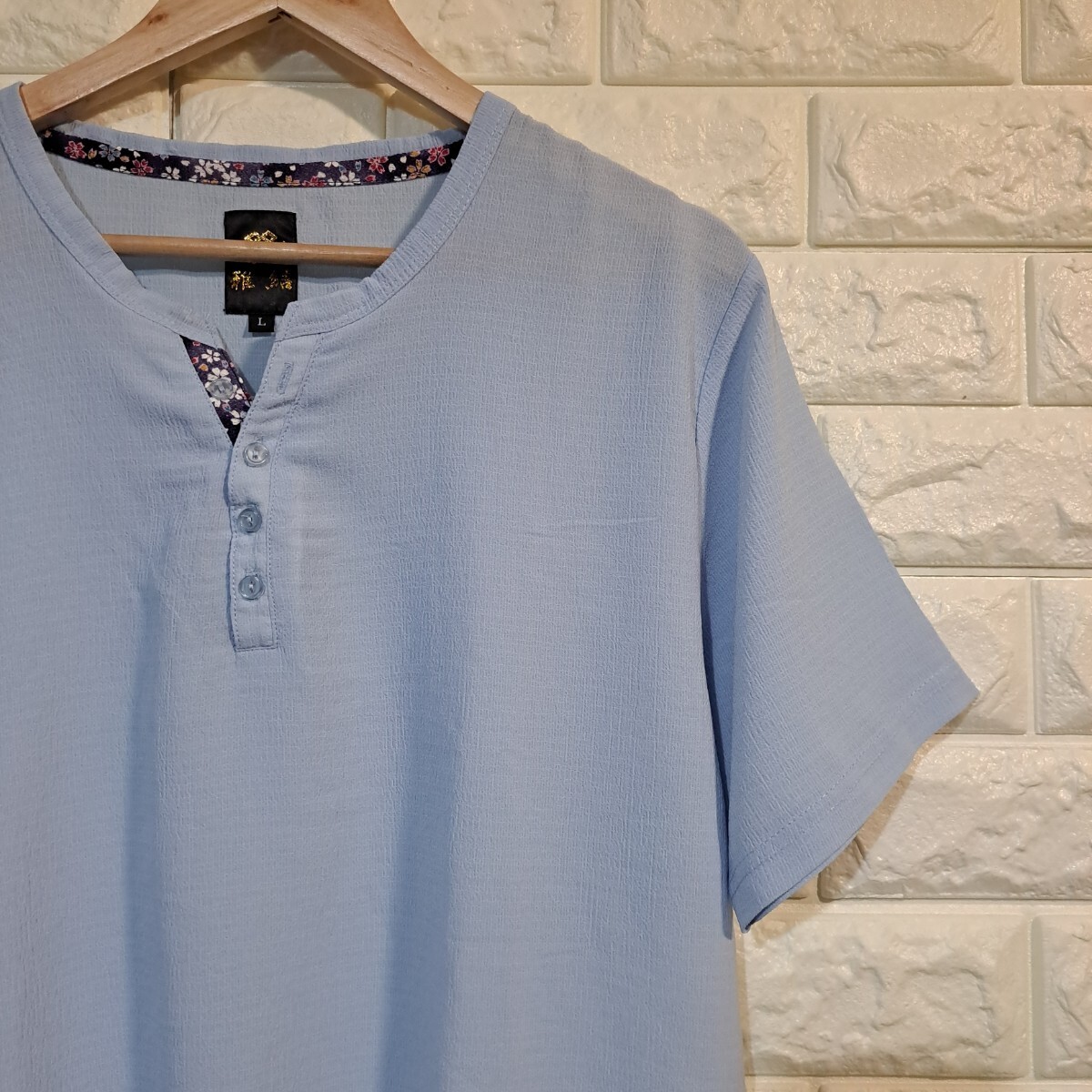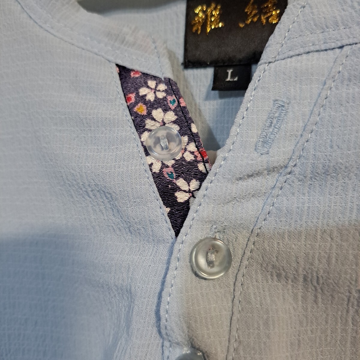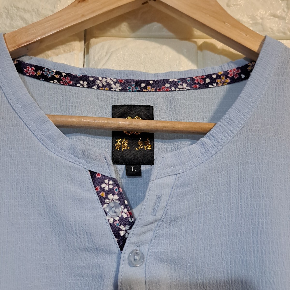 ◆生地は少し凹凸のある楊柳生地、襟元は桜柄ちりめんのラインが入ったヘンリーネックとなっております