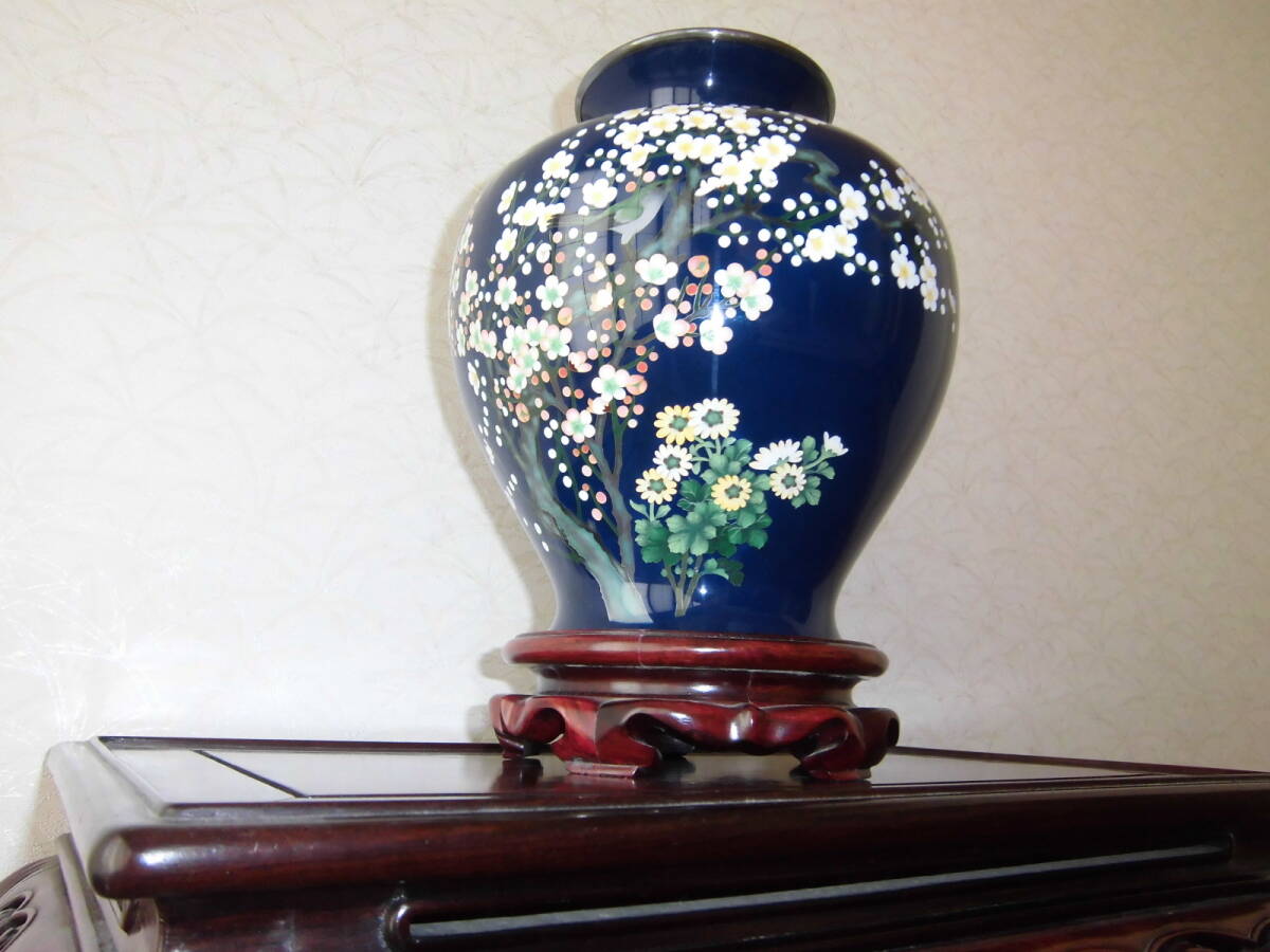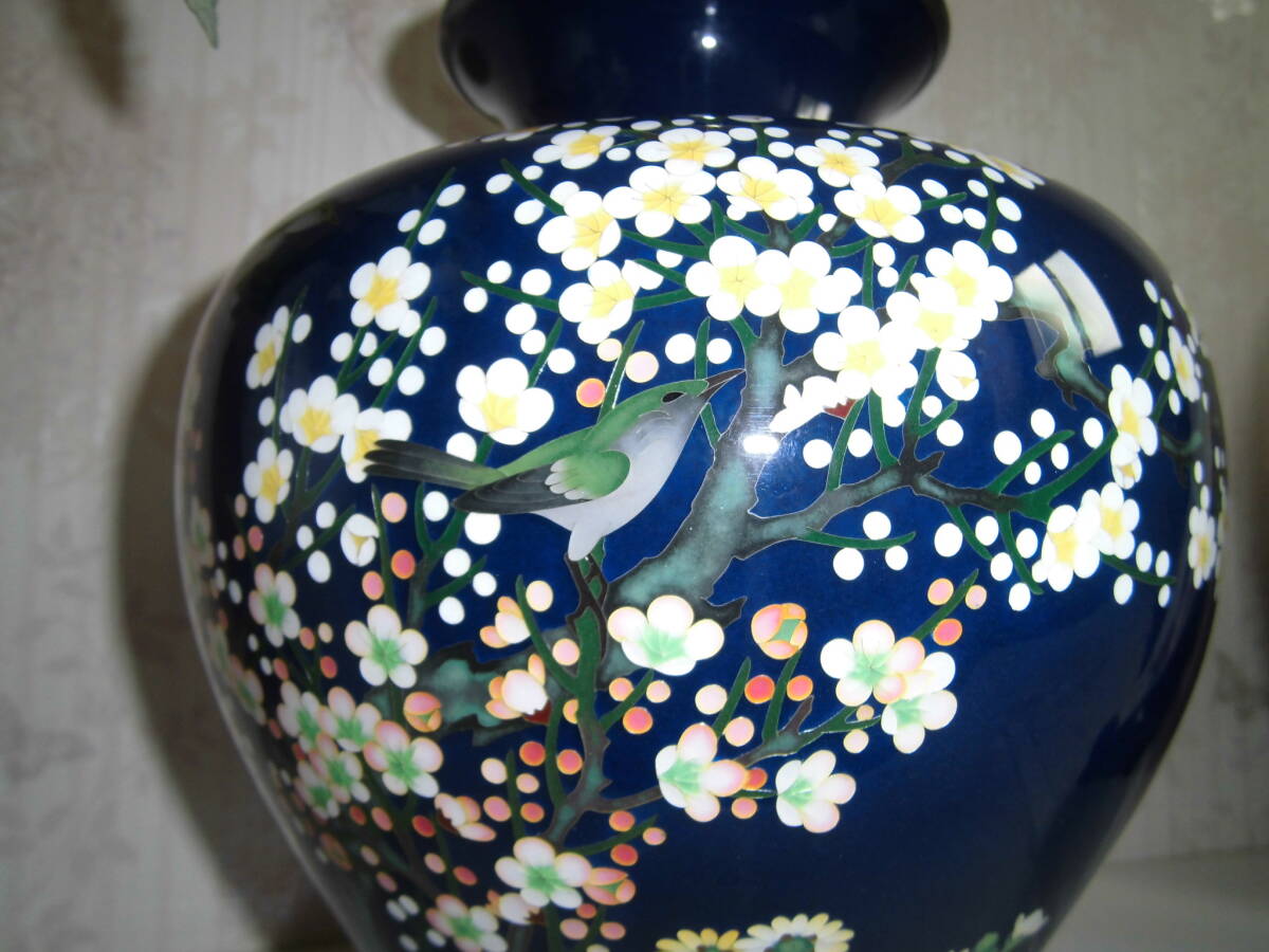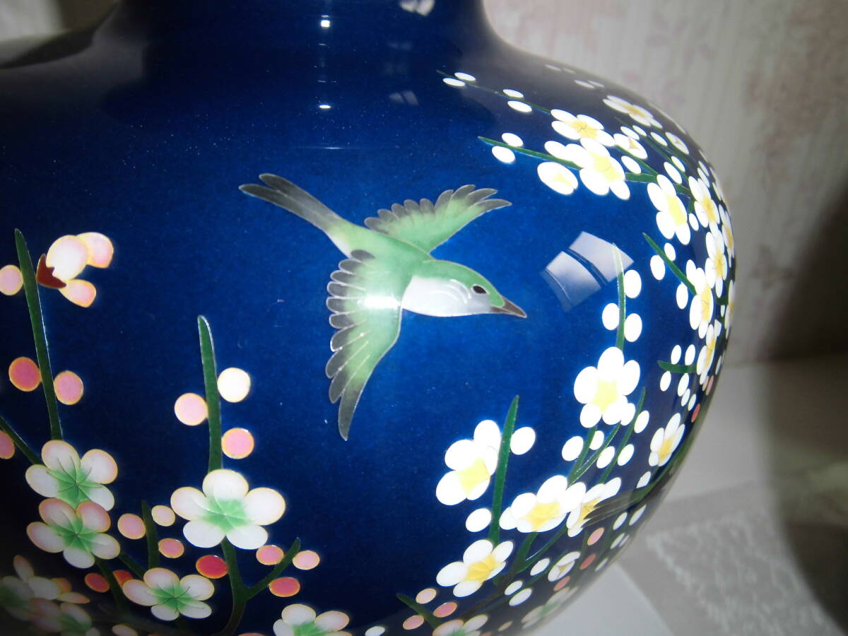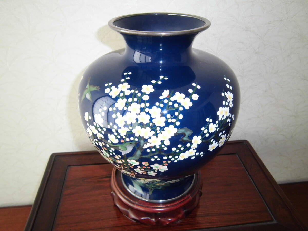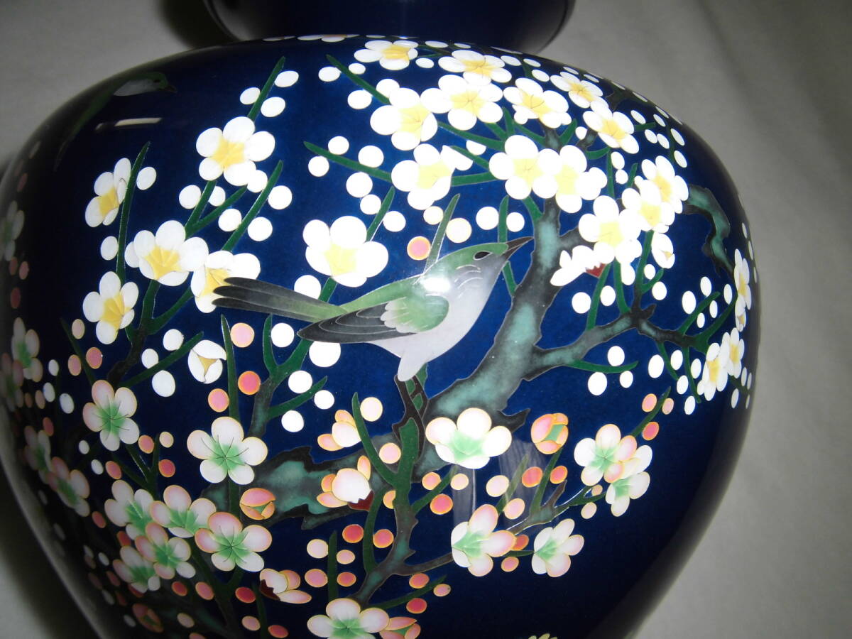 本作は絵付けの巧妙さ・精美さで他の追随を許さない安藤七宝店の高級品で、梅に鶯が丹念に描かれた名品