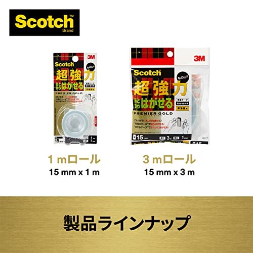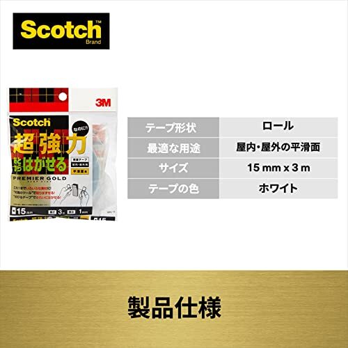 「3M 両面テープ 超強力 なのに あとから はがせる 平滑面用 幅15mm 長さ3m スコッチ SRG-15 セミロング プレミアゴールド」▼4549395369881▼(商品説明)平滑面用・平滑面用 c. セミロング 3m SRG-15・・Size:c. セミロング 3mStyle:平滑面用・スコッチ 両面テープ あとからはがせる超強力プレミアゴールド 幅15x3m SRG-15・荷重の目安:450g(長さ2cm&温度26度で耐えられる重さの目安です。値ではありません。)・接着できる素材:金属、ガラス、内装タイル、硬質ゴム、ポリエチレン・ポリプロピレン、木・用途:A4サイズまでの表札や看板の取り付けに。ETC車載器、携帯電話ホルダーなど車内小物の固定に。・接着できる面:凸凹のない平滑面説明 厚みのある高密度ポリエチレンフォーム基材を使用した、さまざまな素材に強力に接着する両面テープです。 付属のツールを使って、テープを分割することができます。 貼ったものをあとで取りはずすことできます。 超強力両面テープのJIS規格(JIS Z1541)の1種3号レベルの接着力を有します。