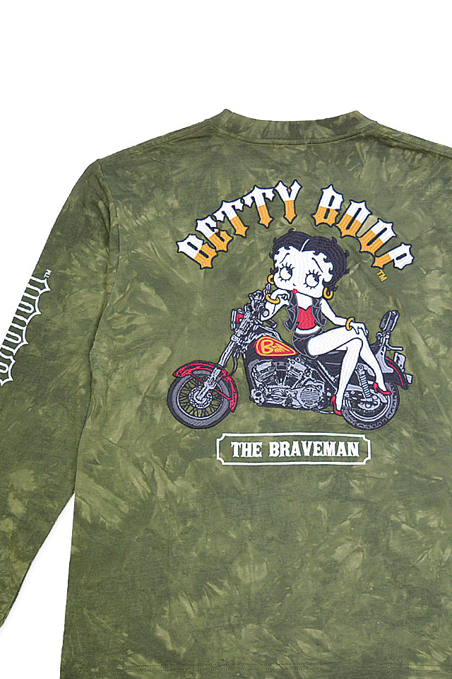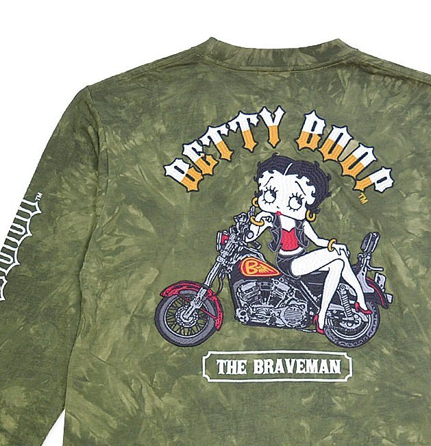 1920年代~40年代にアメリカでワークウェアを中心とした製品を世に送り出したブランド「The BRAVE-MAN」から「BR×BETTYコラボ 天竺ロングTシャツ(BBB-2445)」のご紹介です。 大きな瞳とぽってりした赤い唇が印象的な女の子、ベティ・ブープ(Betty Boop)。 背中には愛車に腰掛けるベティの姿が刺繍で落とし込まれています。 絵柄上部のロゴにも刺繍を、絵柄下のブランドロゴはプリントで表現。 バックにしっかり柄を入れている分、フロントはシンプルにデザインし、メリハリを付けました。 ボディーには天竺生地を採用。 襟元、袖口にはリブを縫い付け、野暮ったさを軽減しました。 カジュアルに着こなしに取り入れることの出来る、大人のキャラクターアイテムです。 | |||||||||||||||||||||||||