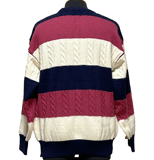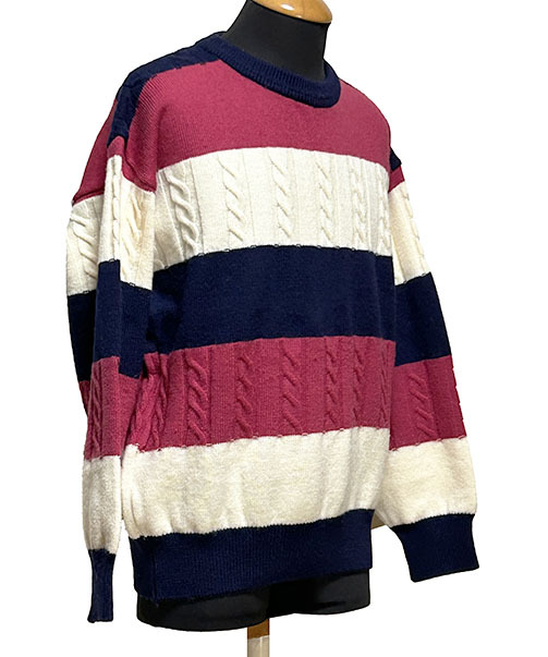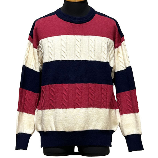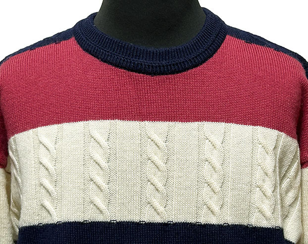 丸首、部分ケーブル編みで、幅広のボーダー柄です。