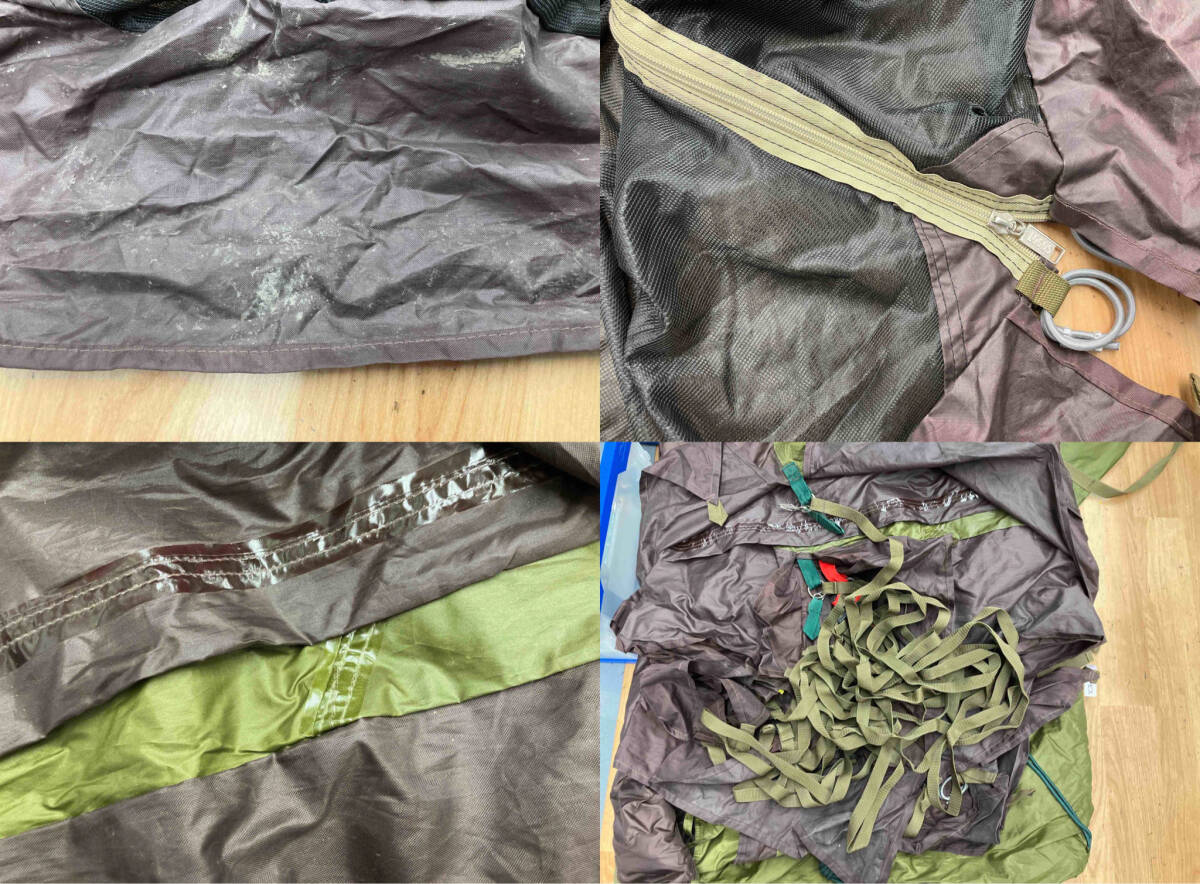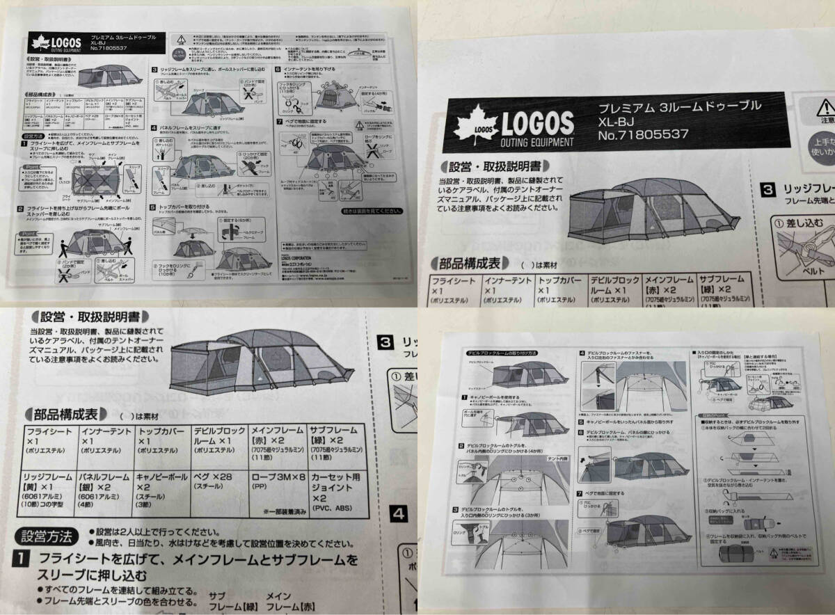 | 付属品は画像ものが全てです。 メーカー名:LOGOS モデル名:3ルームドゥーブル XL-BJ セット内容:テント本体、メインフレーム2本、サブフレーム2本、リッジフレーム1本、パネルフレーム2本、キャノピーポール2本、 ※ペグ、ロープ欠品 |