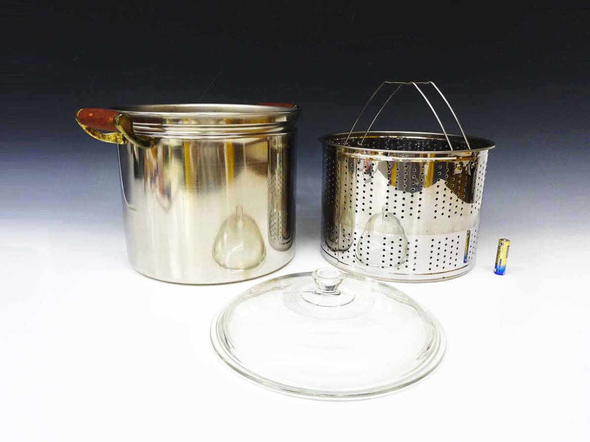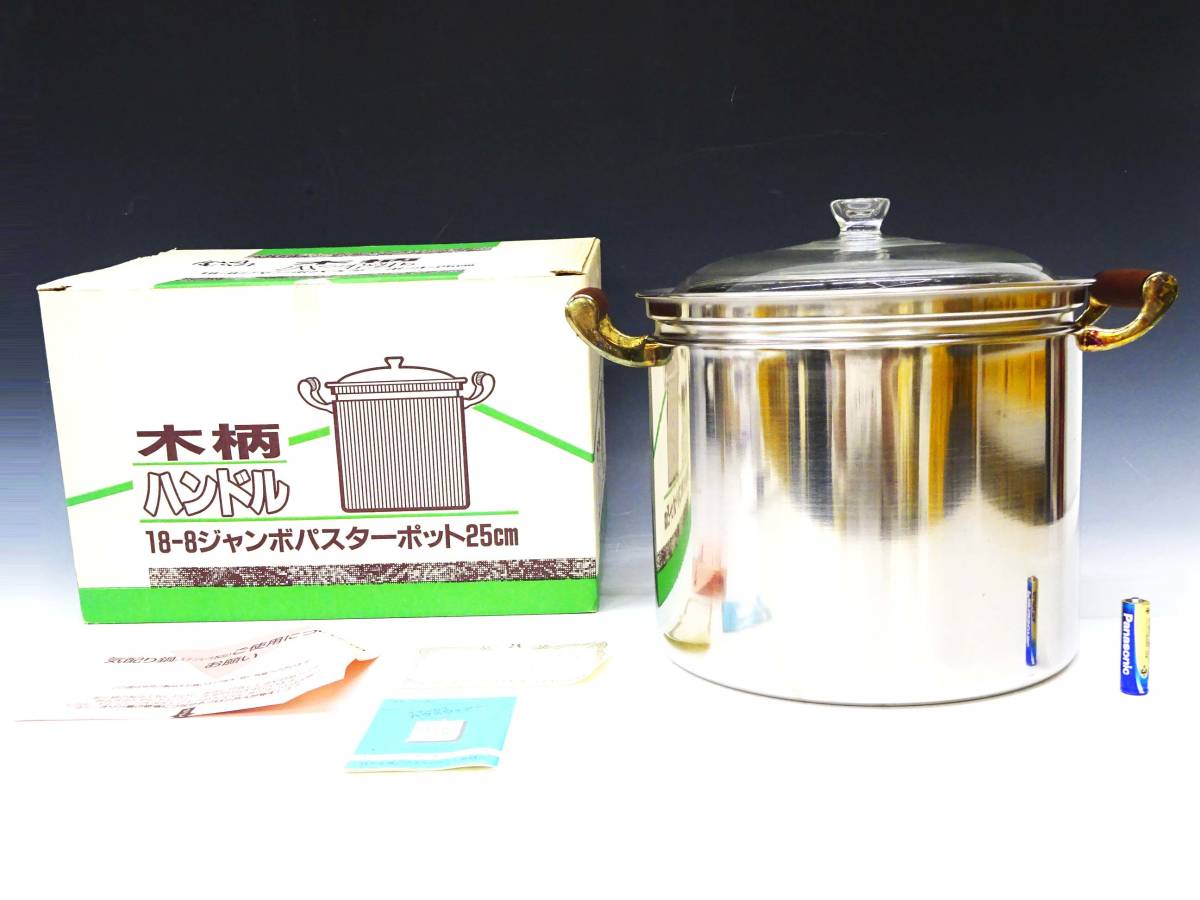 ◆(TH) 木柄ハンドル パスタポット 直径 約25cm ステンレス製 ガラス製蓋 中カゴ しおり・元箱付き 両手鍋 パスタ鍋 調理器具