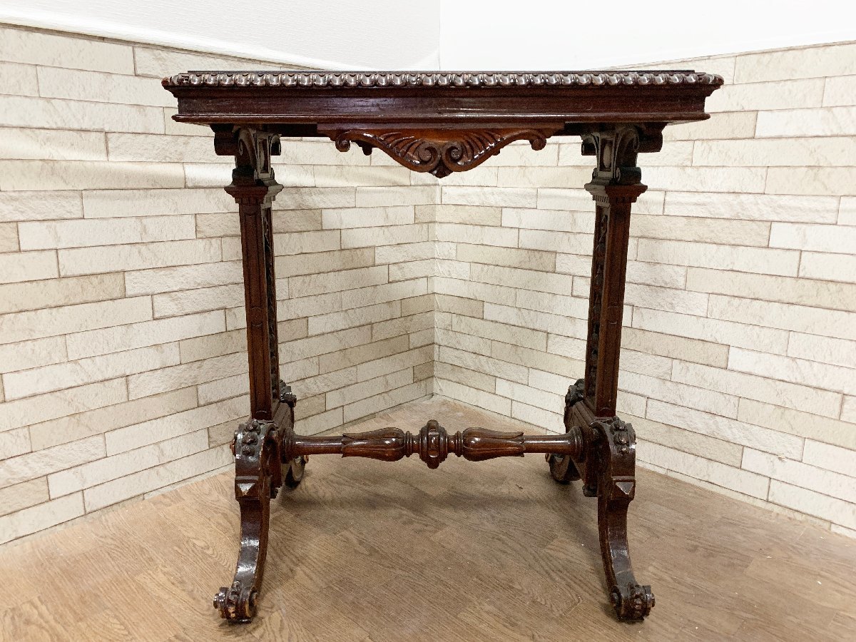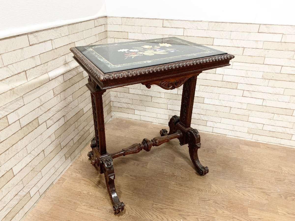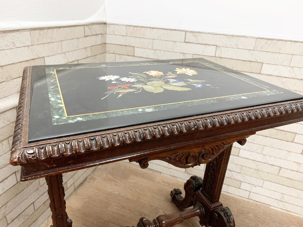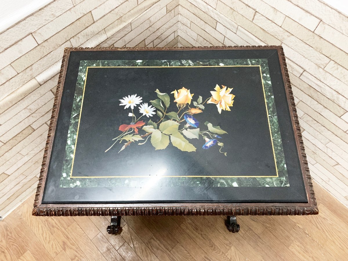 ルネサンス様式 コーヒーテーブル 机 花 フラワー 彫刻 木製 大理石調 サイドテーブル アンティーク 家具 インテリア (貝297)