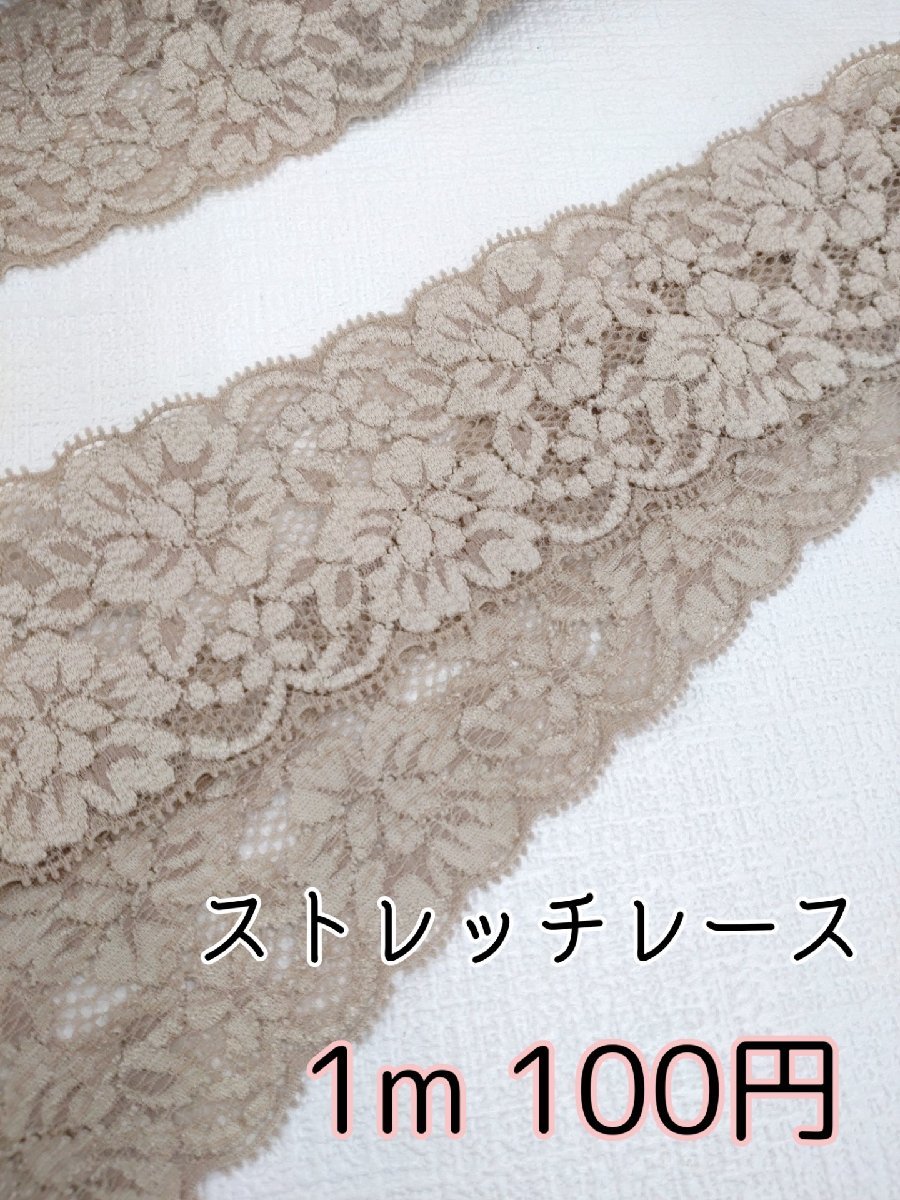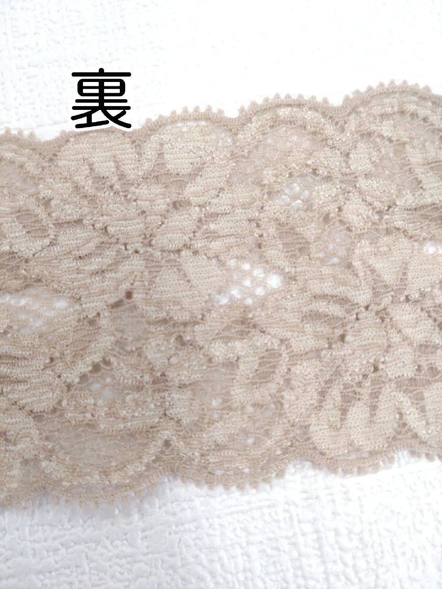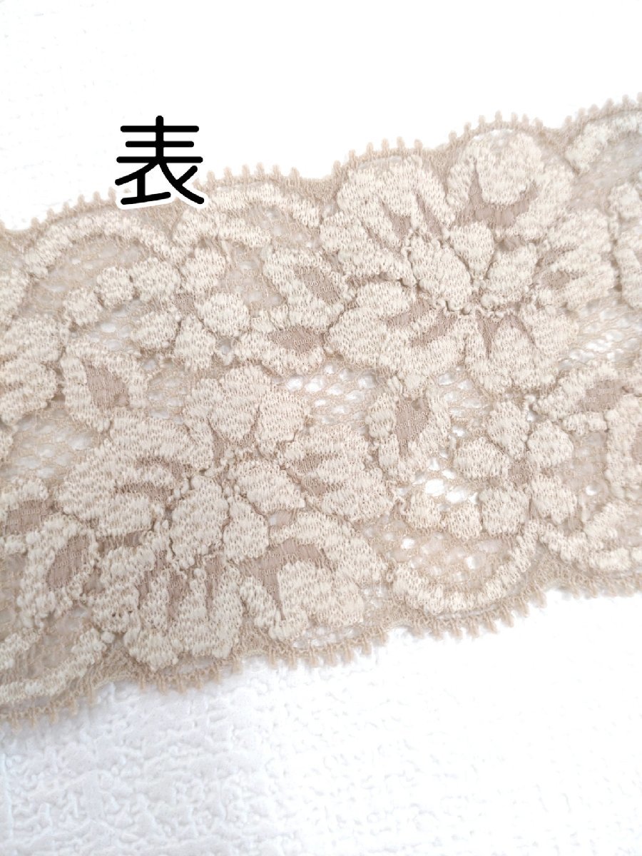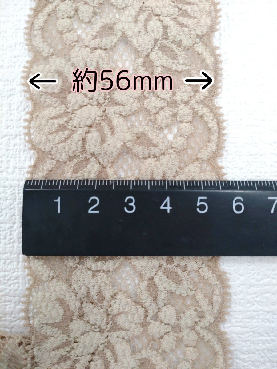花柄のストレッチレース(伸びる素材)です。お洋服やお人形など手作り品にご使用いただけます。サイズ:約56mm幅厚み:普通色:ベージュ※こちらの商品は1m単位でのご注文となります。1mの場合…個数を1と入力3mの場合…個数を3と入力