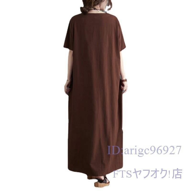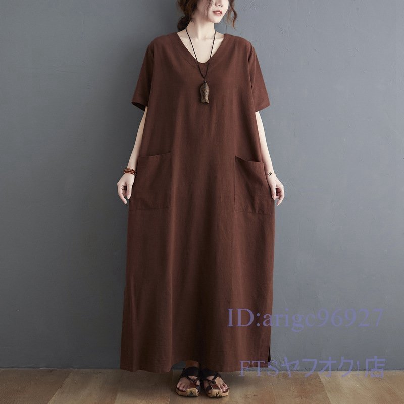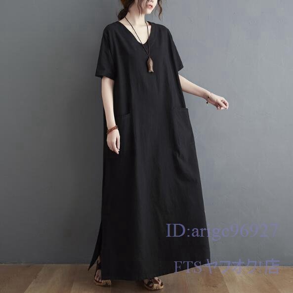 S853☆新品レディース ワンピース 綿麻 半袖 マキシロングワンピース 無地 Vネック スリット ゆったり大きいサイズ 黒 F