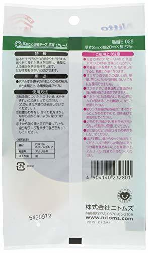 「ニトムズ 戸あたり消音テープ 広幅 グレー 3mm×20mm×2m E028」▼4904140232801▼(商品説明)a_1巻入り・グレー 3mm×20mm×2m E028・・Style:a_1巻入りSize:3mm×20mm×2mColor:グレー・基材:合成ゴム(NBR)・ポリエステルフィルム・粘着剤:アクリル系粘着剤・カラー:グレー・ドアの戸当たり音を静かに、目立たない薄手タイプ・冷暖房効率アップに効果的わずか3mmの薄型消音テープ 玄関ドアや引き戸の戸あたり音をシャットアウト。 同時に室内の密閉性も高めるので、冷暖房効率もグンとアップ。
